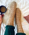 These warm, cabled DK socks are inspired by cozy days spent indoors baking cookies, snuggling up by a fire and drinking hot chocolate, reading, or knitting. The socks feature a repetitive cable pattern, where the cables are spaced further apart for a simple and relaxing knit. The pattern includes instructions for working the cables both with and without a cable needle.
