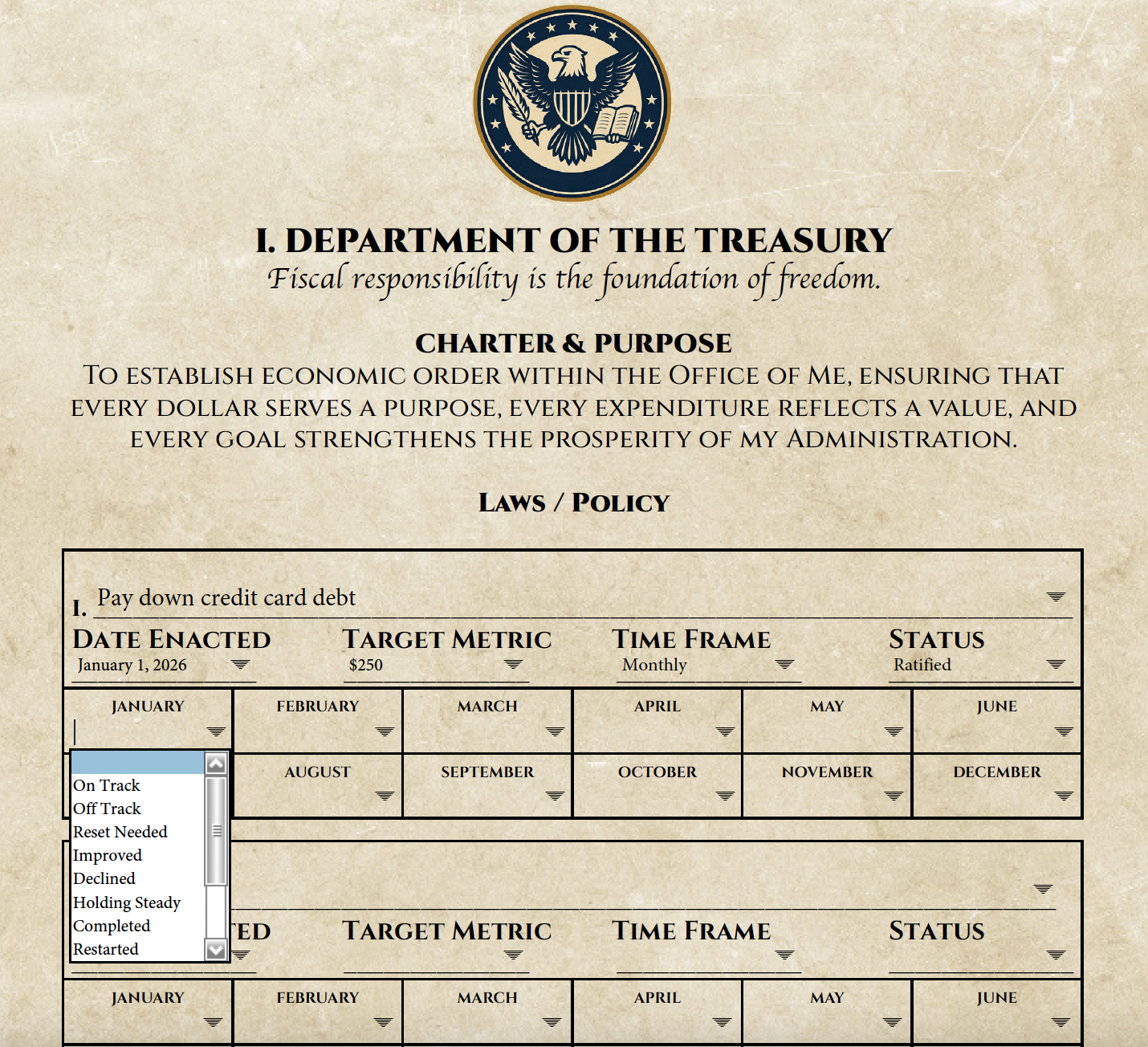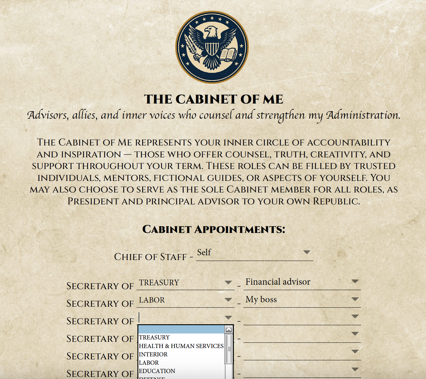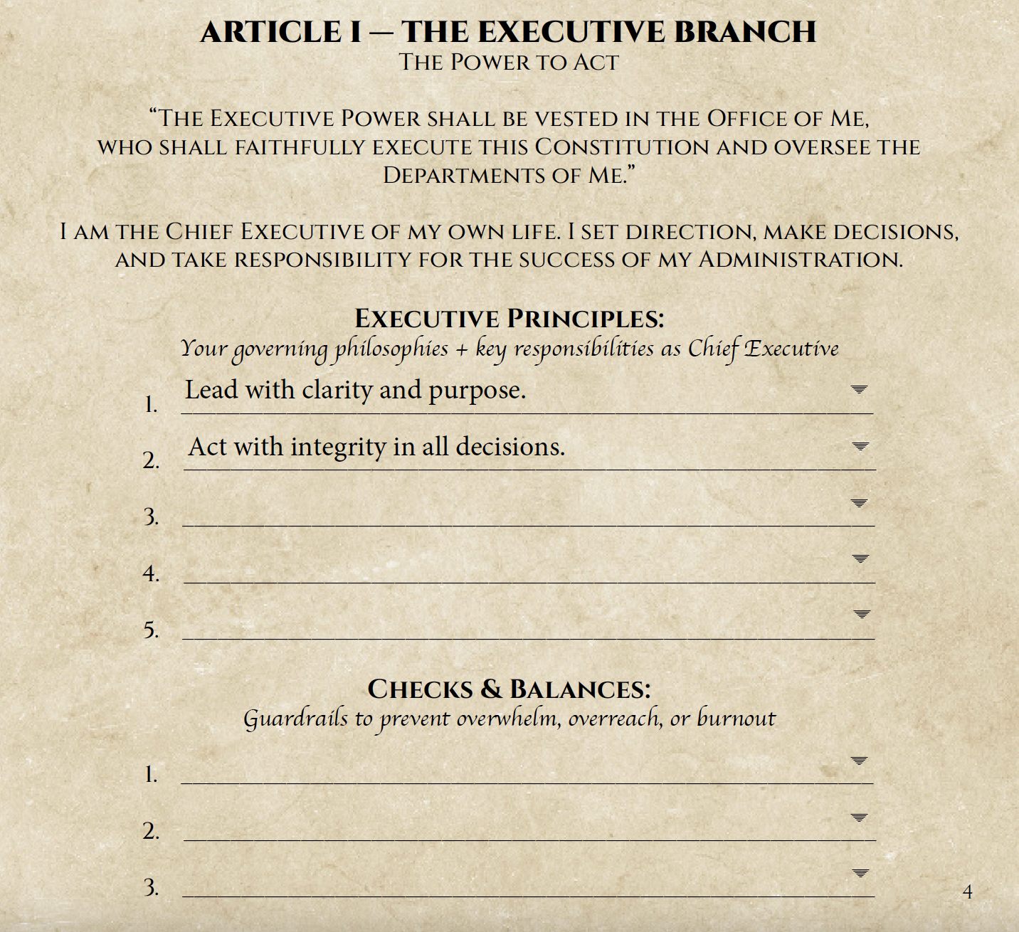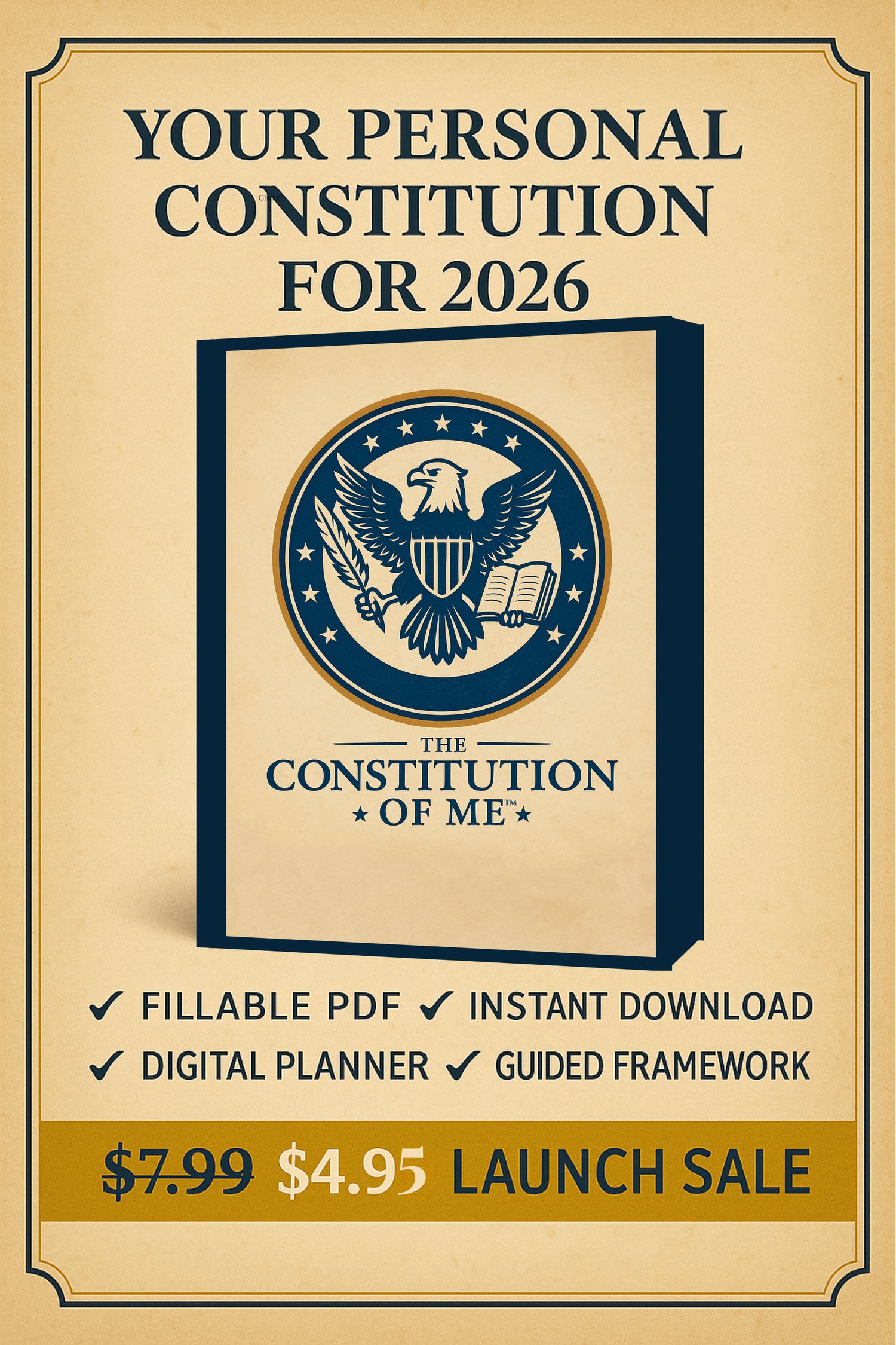 The Constitution of Me™ is a self-governance workbook and digital planner that helps you run your own personal “administration” for 2026. Build your Cabinet, ratify your Bill of Rights, and set real-life Executive Orders around habits, goals, priorities, and boundaries.