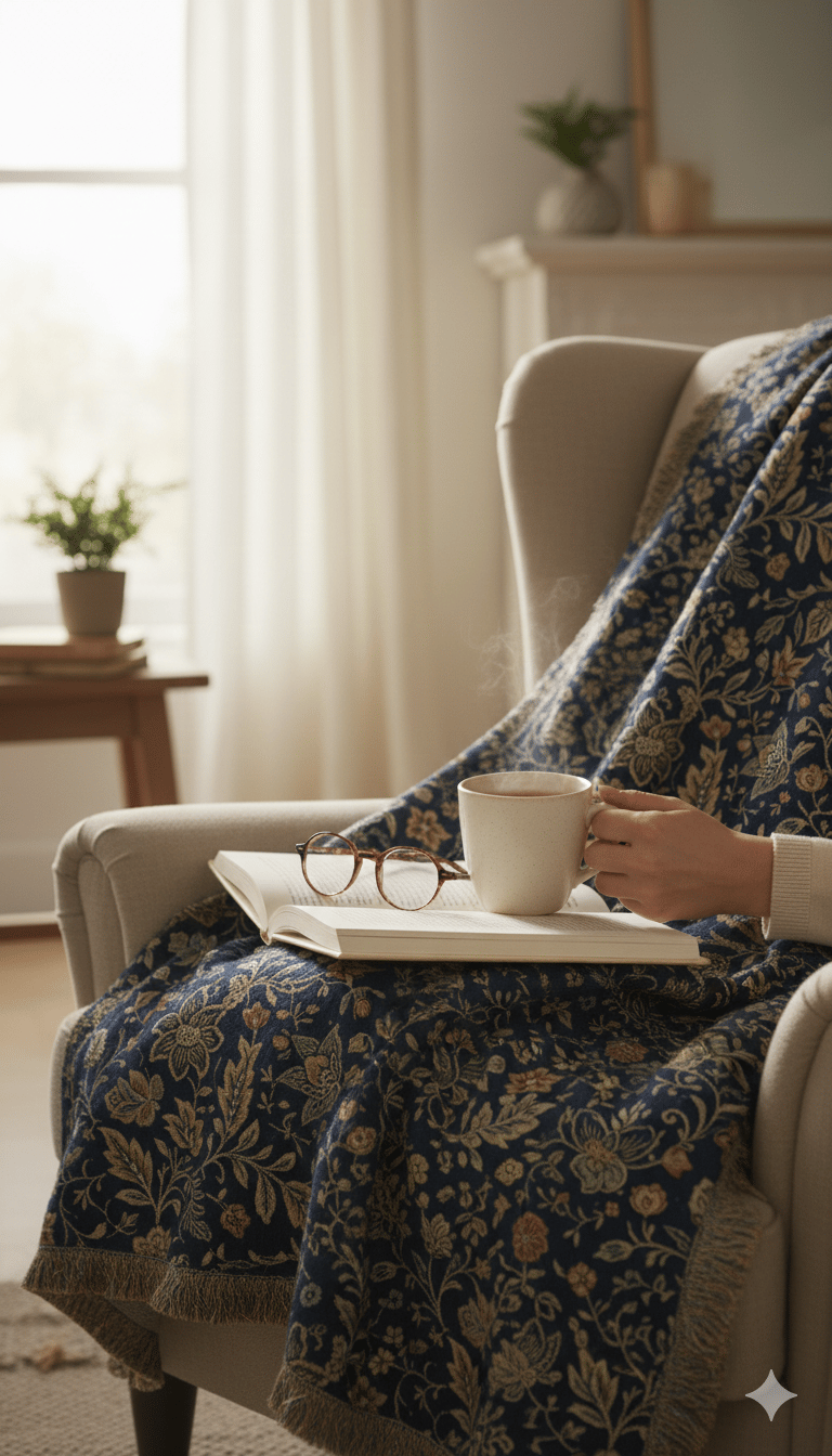 - Living Room: Drape it over a velvet armchair or a neutral-toned sofa to make the gold patterns "pop."