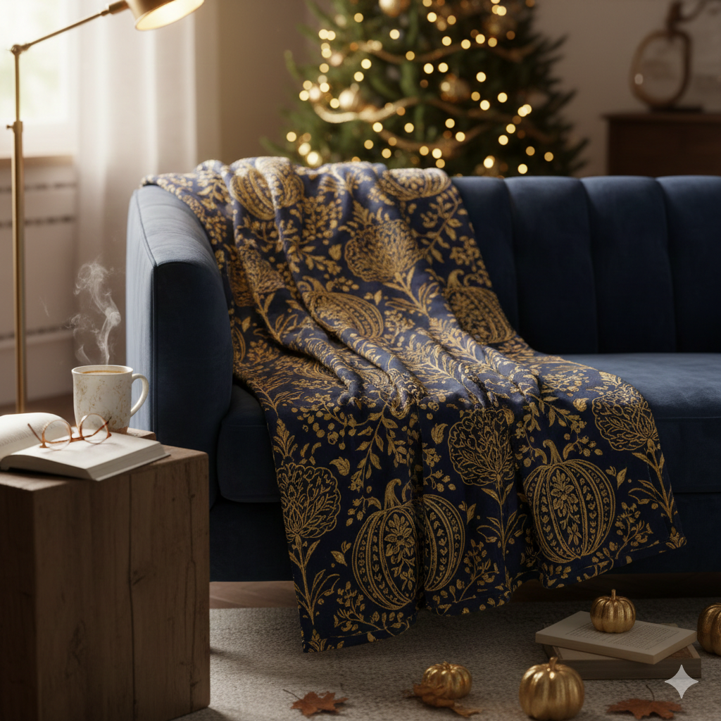 Navy blue and gold throw blanket, luxury floral sofa throw, autumn inspired home decor, gold pumpkin pattern blanket, elegant navy bedspread, cozy winter home accessories, botanical print throw, high-end navy blue blanket, stylish living room accents, dec
