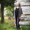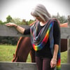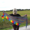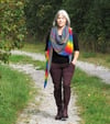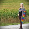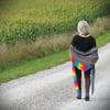 This generously sized shawl starts at the point and increases to the paneled border. Rows of eyelets mark the last repeat of each section, and the sections intersperse rows of colourful stripes with bands of solid colour.