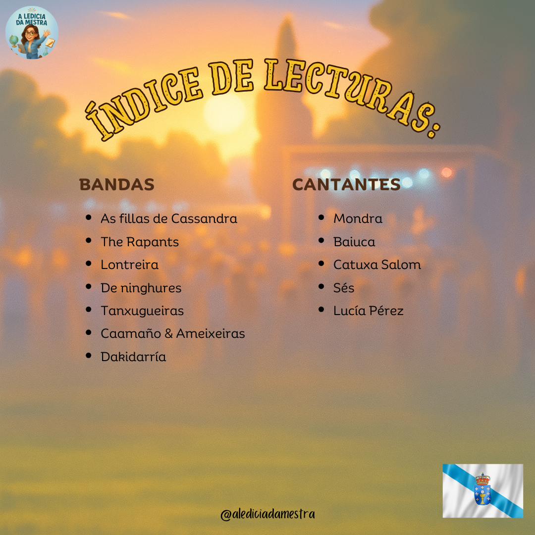 Aquà atoparás lecturas, actividades, sopas de letras, encrucillados e cancións que che axudarán a descubrir novas voces, a entender as súas letras e a gozar coa creatividade musical da nosa comunidade autónoma.