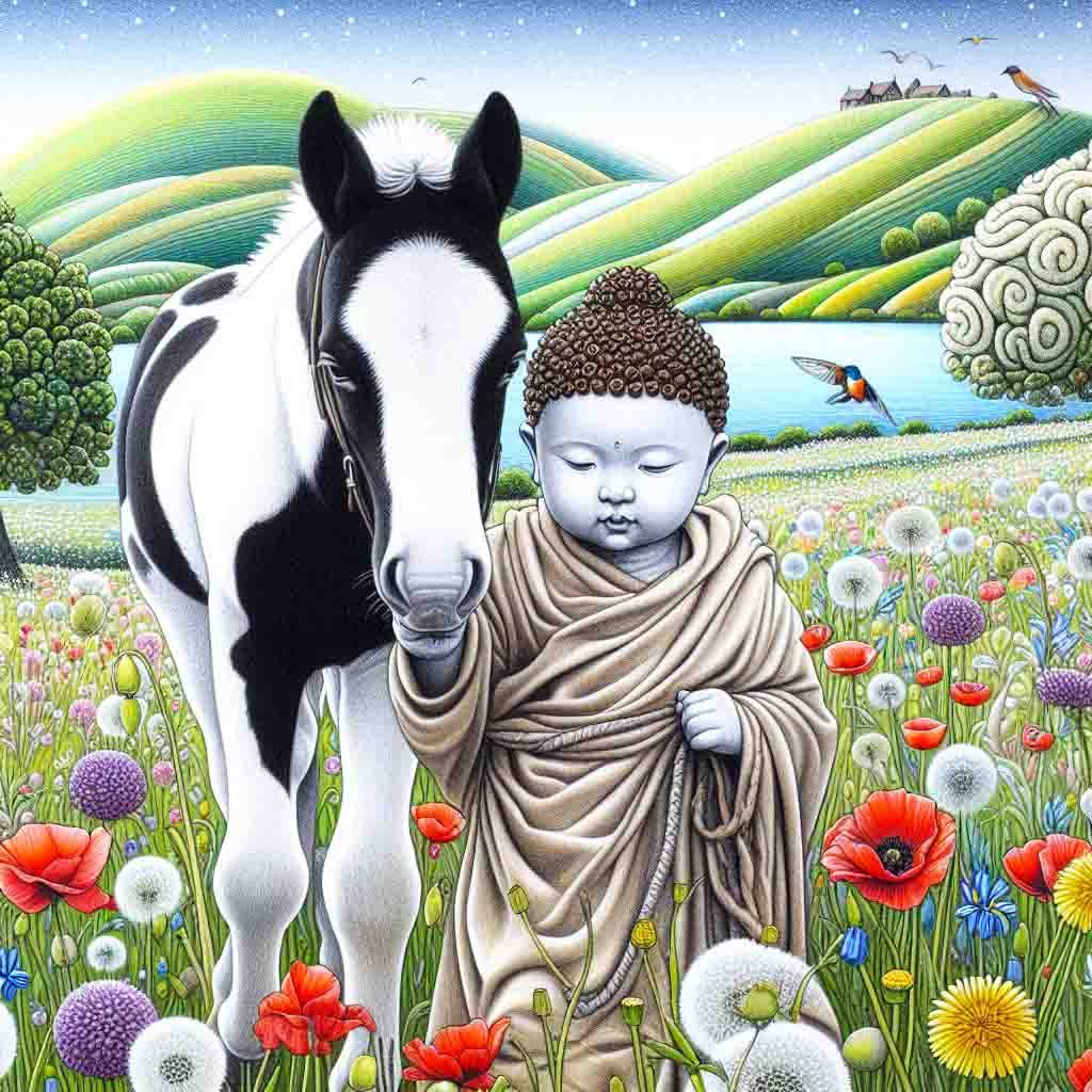 Young Buddha child with his horse, walking through flowers. There is a lake and high hills.
