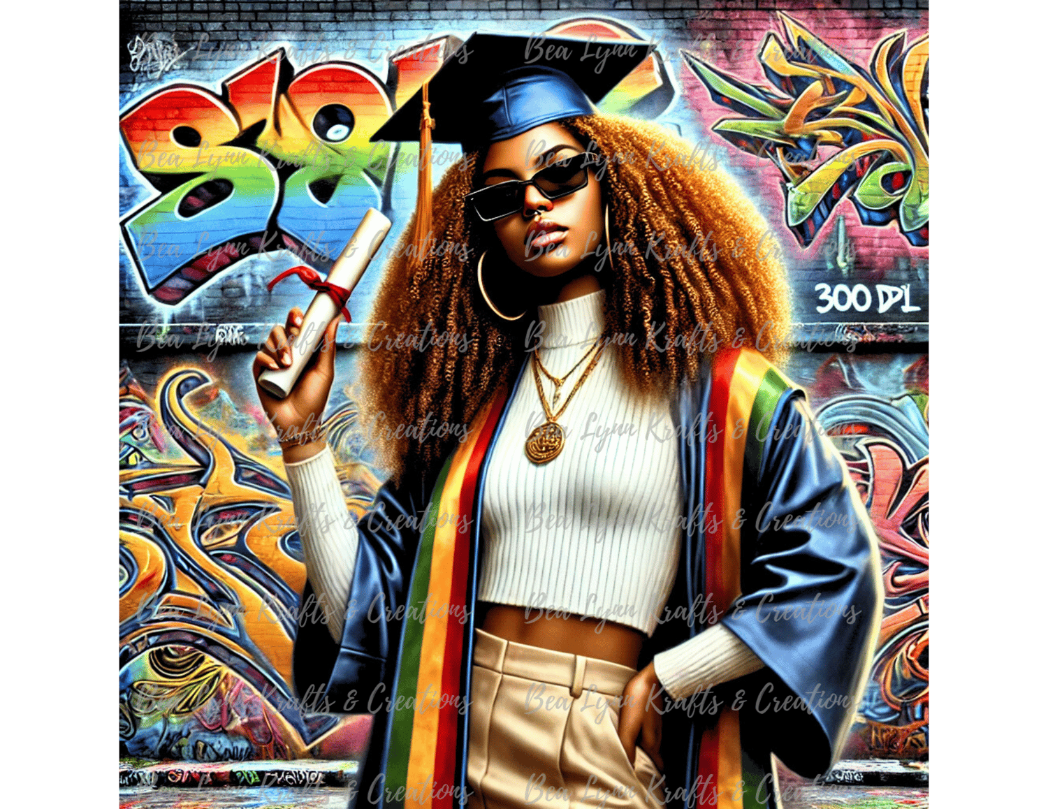 Celebrate unapologetic success, heritage, and empowerment with this bold Transparent HBCU African American Graduate PNG. This high-resolution design features a confident Black woman grad in a vibrant stole and modern streetwear style, holding her diploma with pride against a colorful graffiti backdrop.
