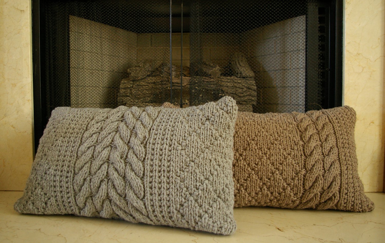 These wonderfully chunky pillows take three standard Aran stitches and play with the order they are worked across each pillow. What a difference this order makes to the look and feel of each – one has a “typical” Guernsey look with a center panel flanked by cables and a broken rib stitch, while the other clusters those same cables in the center with the panel broken up and edged with the rib on both sides. These pillows are fast and cozy – a great project for the knitter’s home!