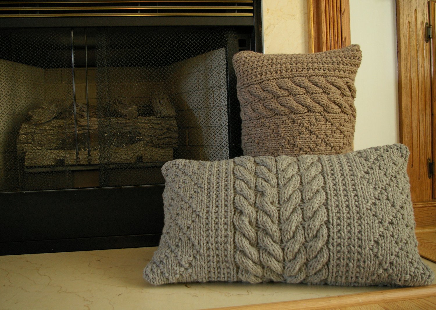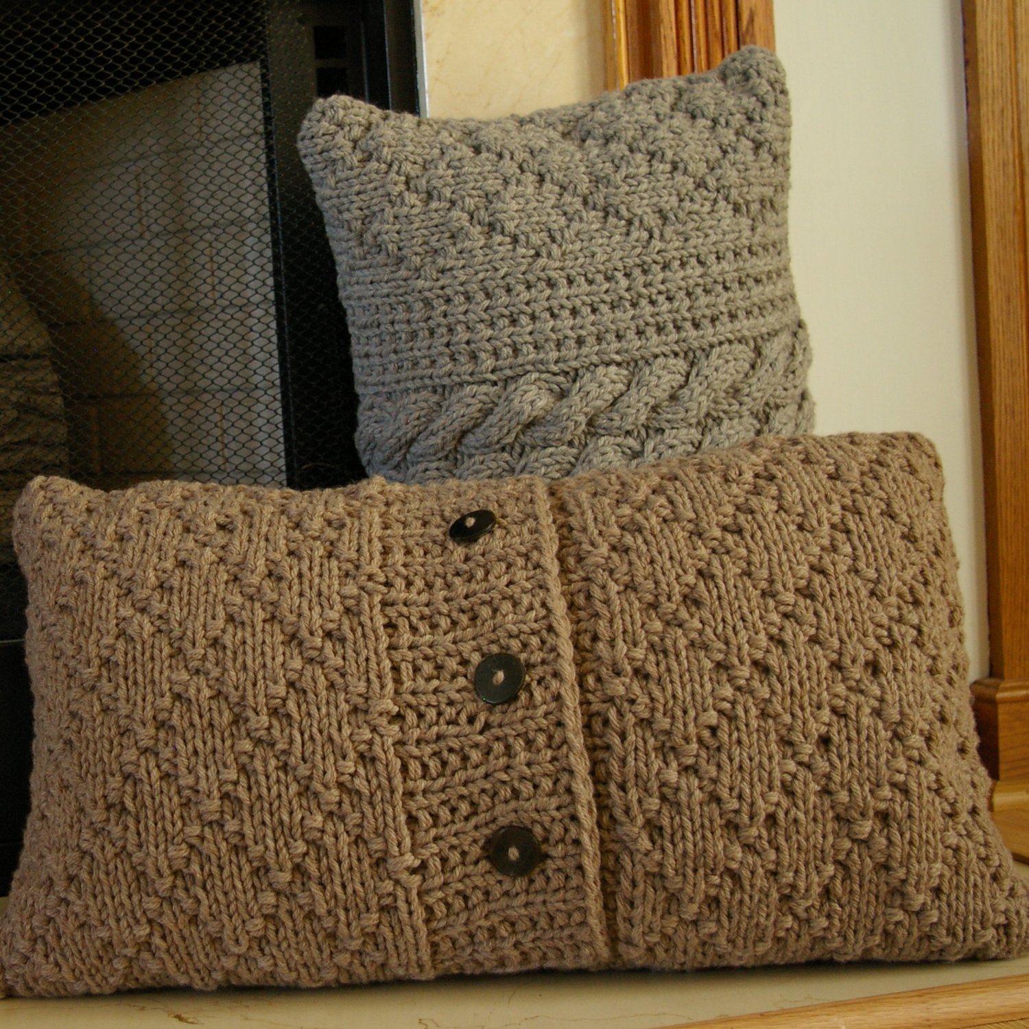 The two pillow versions are each knit flat in three sections, with yarn held doubled throughout. First the two halves of the back are knit from the bottom up and then the button plackets are picked up and knit along one side. Then the fronts are worked from the bottom up. Finishing is simple: sew together the pieces, add some buttons, and weave in the ends. Pop in the pillow form and you’re all done!