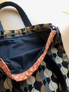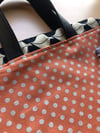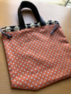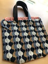 Measures between 32-35 cms by 32-38 cms, has 1 inside pocket, leather handles made from waste of shoes industry.