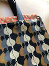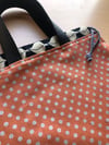 Mede entre 32-35 cms por 32-38 cms, tem um bolso interior, alças em pele feitas a partir de desperdício da indústria do calçado.