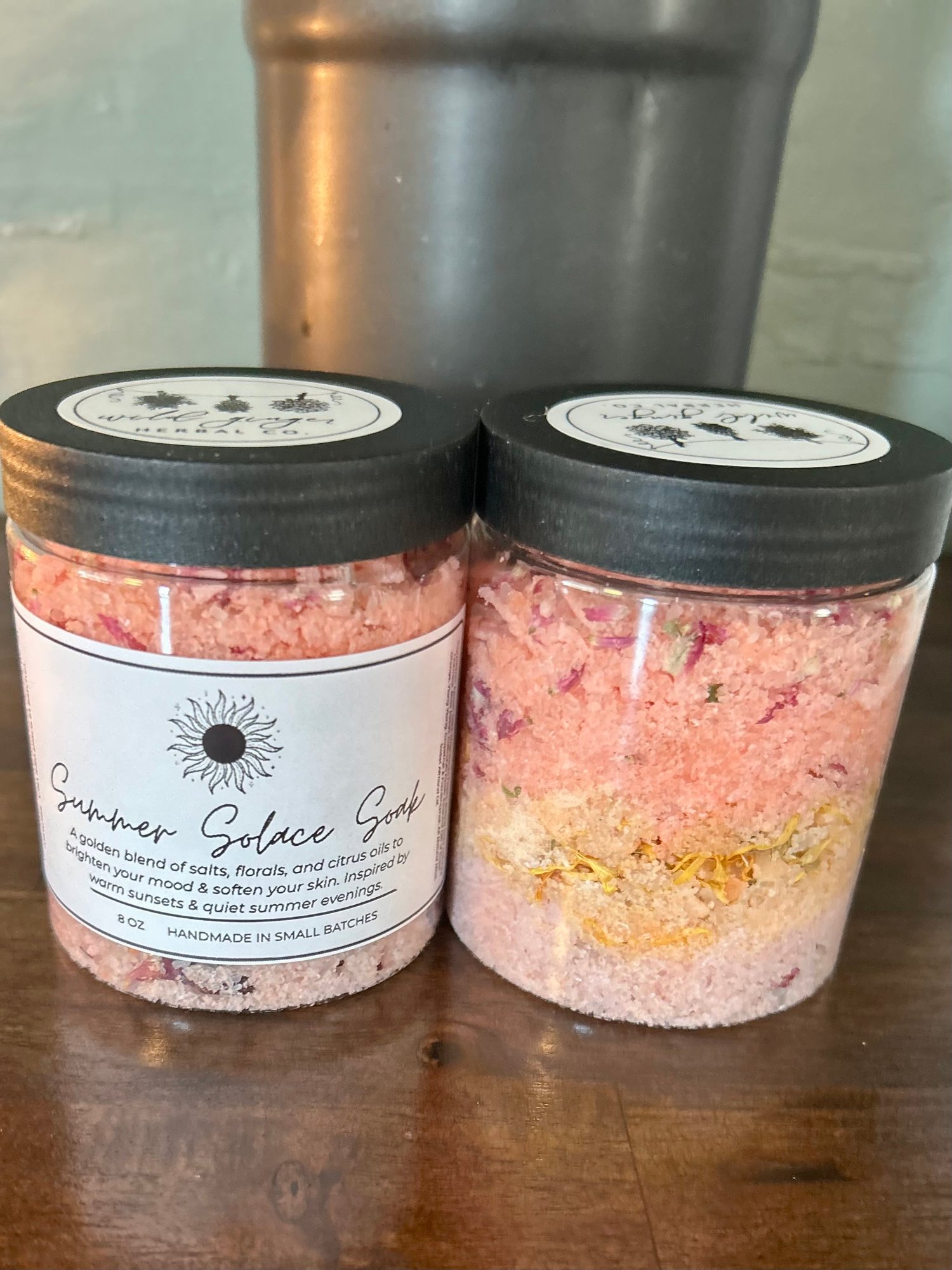 Step into a radiant moment of calm with Summer Solace — a golden, botanical bath soak designed to capture the essence of warm evenings, blooming gardens, and sun-kissed skin. Hand-layered with vibrant florals and kissed with citrus shimmer, this therapeutic soak soothes tired muscles, nourishes dry summer skin, and uplifts your spirit with a soft, sensual aroma.