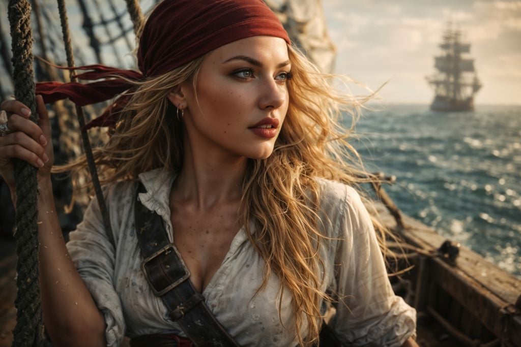 Bring the romance and danger of the open sea straight into your collection with Saltwind Siren—a striking 10K pirate portrait that feels like a scene lifted from an epic film. Sunlit spray, wind-tossed hair, weathered canvas and rigging… and that fearless, far-horizon stare that promises trouble (and treasure) ahead.