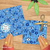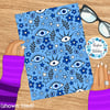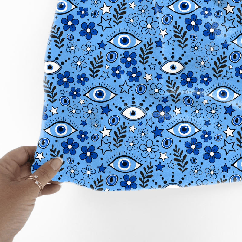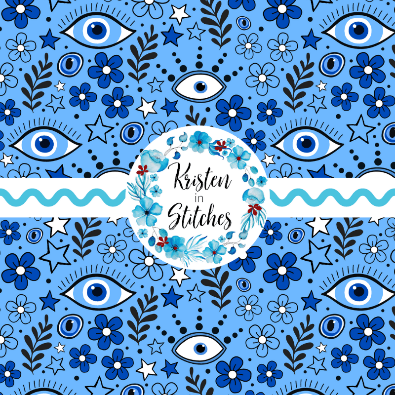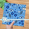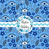 A playful blue and white seamless pattern featuring evil eyes, flowers, stars, and leaves — a modern boho design symbolizing luck and protection.