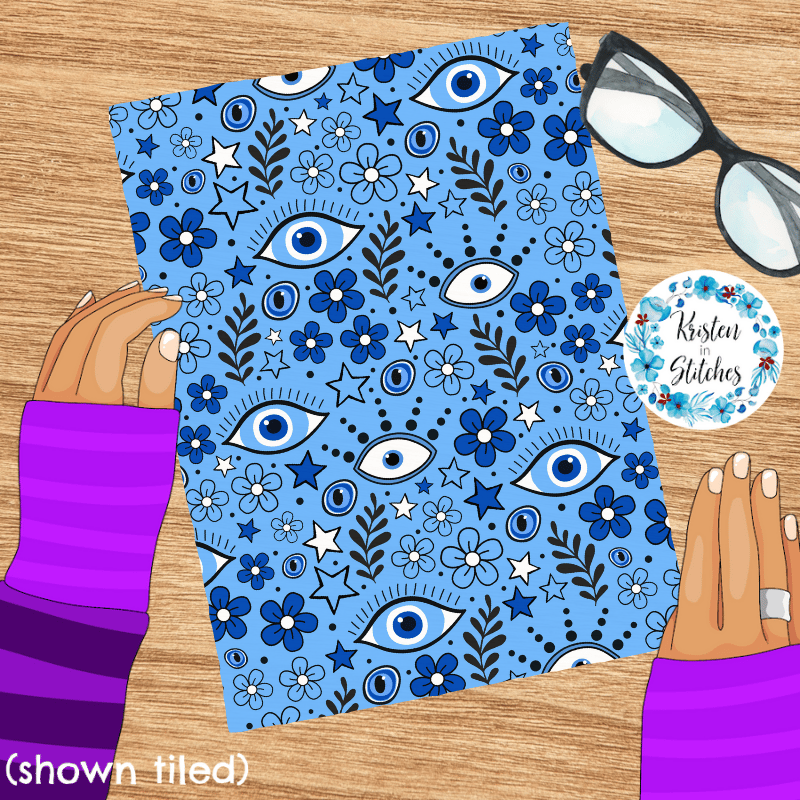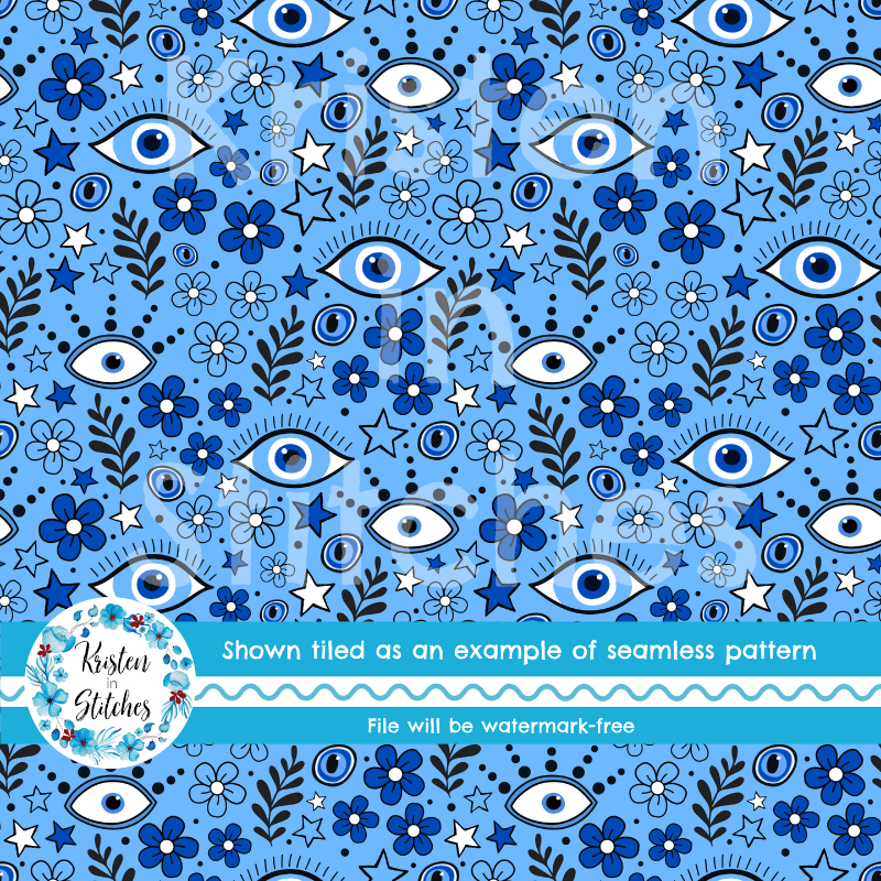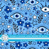 Blue Evil Eye Seamless Pattern, Folk Art Floral