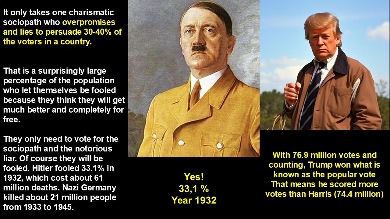 They only need to vote for the sociopath and the notorious liar. Of course they will be fooled. Hitler fooled 33.1% in 1932, which cost about 61 million deaths. Nazi Germany killed about 21 million people from 1933 to 1945.