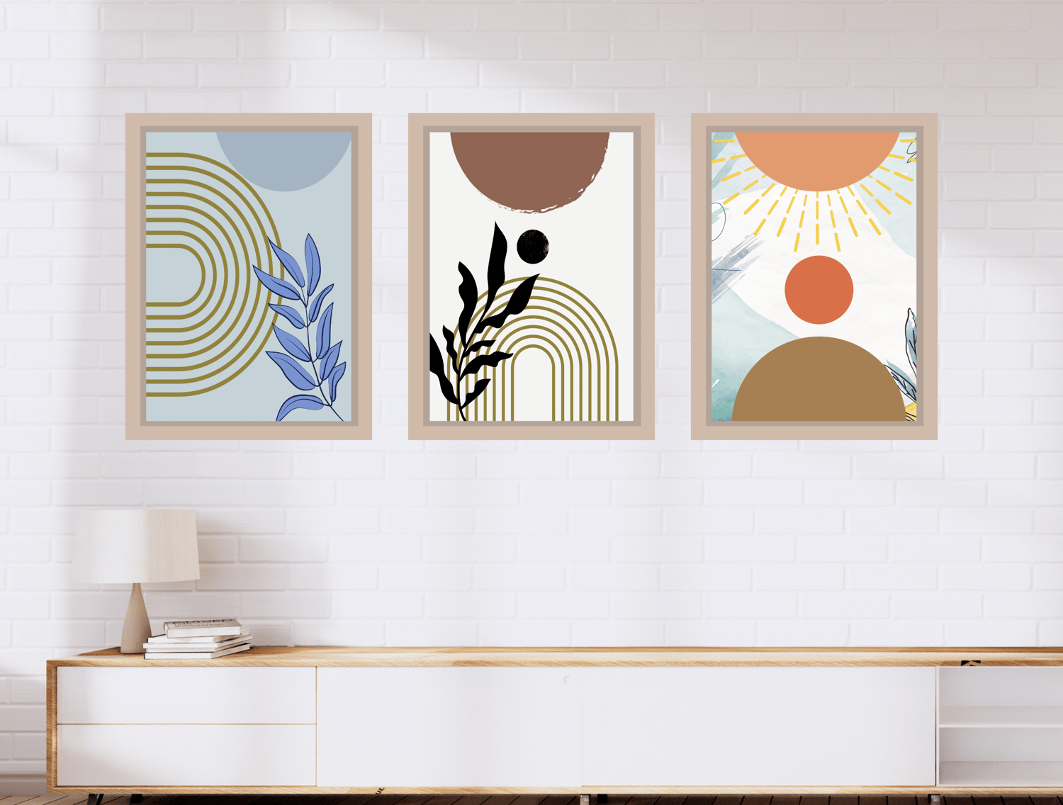 A beautiful minimalist Set of 3 Mid Century Art Prints, Neutral Modern Wall Art Decor, Boho Style Art Prints Earthy Prints, Green and Brown Rainbow. Perfect for a pop of modern color for your living room, dining room, bedroom, or entry walls. These will also make a great gift.