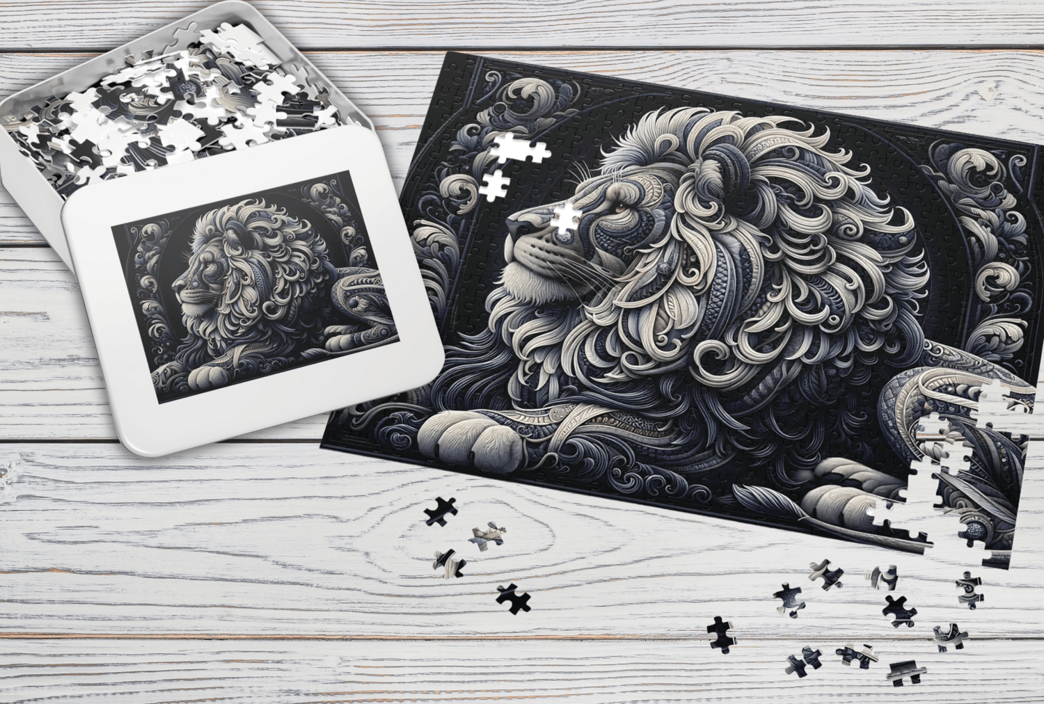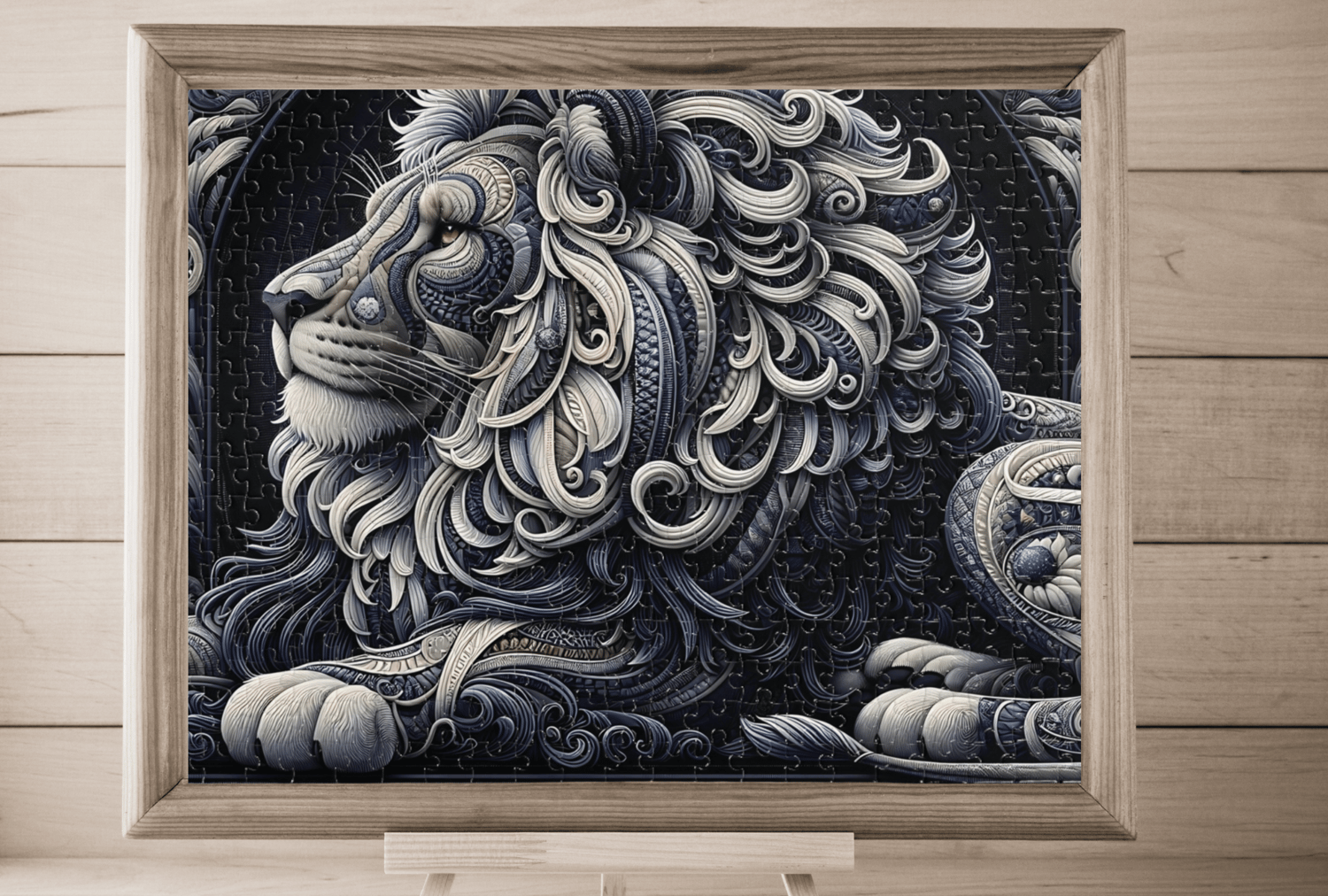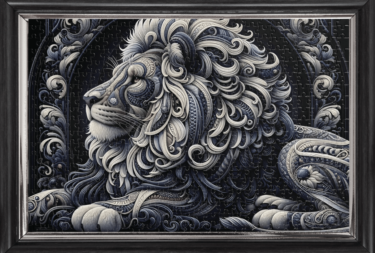 Unravel the splendor of "Sovereign Whorls The Lion’s Baroque Elegance," a puzzle steeped in majesty and intricacy in both 1000-piece and 500-piece formats. This luxurious depiction frames a contemplative lion, its regal form a labyrinth of sculptural baroque detailing, its mane a cascade of curvaceous filigrees. As the puzzle journey unfolds, each piece reveals the exquisite harmony of contrasting hues, bringing to life the tactile mane and thoughtful gaze of the lion, all set within a boundary of lavish ornamental designs. Tailored for the puzzle enthusiast with an eye for sophistication and a love for the king of the jungle, this piece transforms the act of puzzle assembly into an art form, resulting in a grand display of artistic excellence and the timeless essence of the lion.