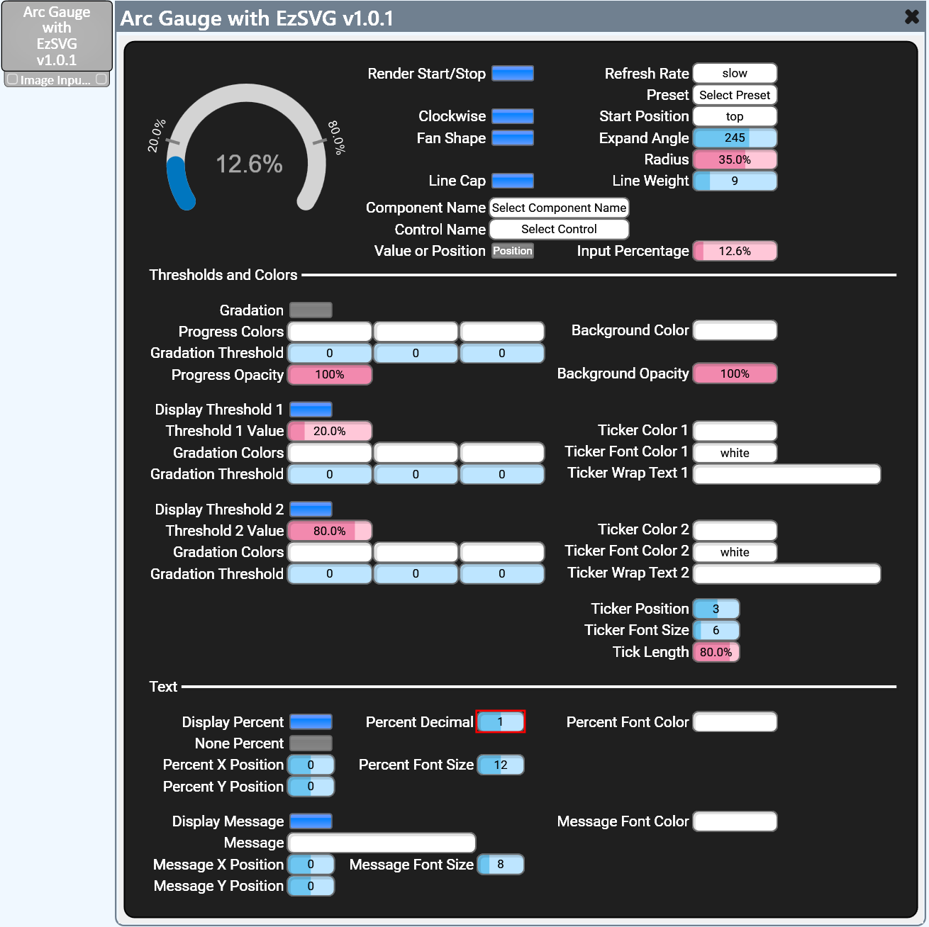 This plugin creates dynamic, customizable SVG gauges that can be displayed directly in UCI panels. Transform any linked float or array control into a live, animated arc gauge with smooth gradients, threshold-based color changes, and radial tick marks.