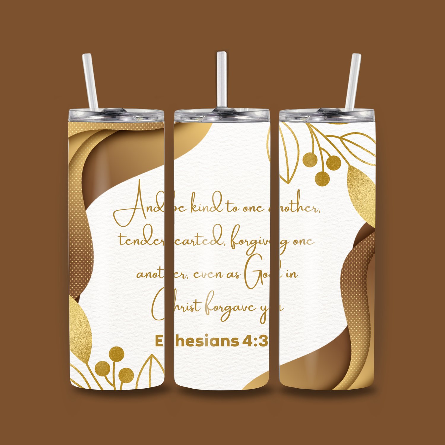 Show kindness in style with this elegant 20oz Ephesians 4:32 Christian Tumbler, beautifully designed in warm tones of gold, cream, and soft brown. Featuring the scripture “And be kind to one another, tenderhearted, forgiving one another…” this tumbler blends a luxury aesthetic with meaningful encouragement for daily life.