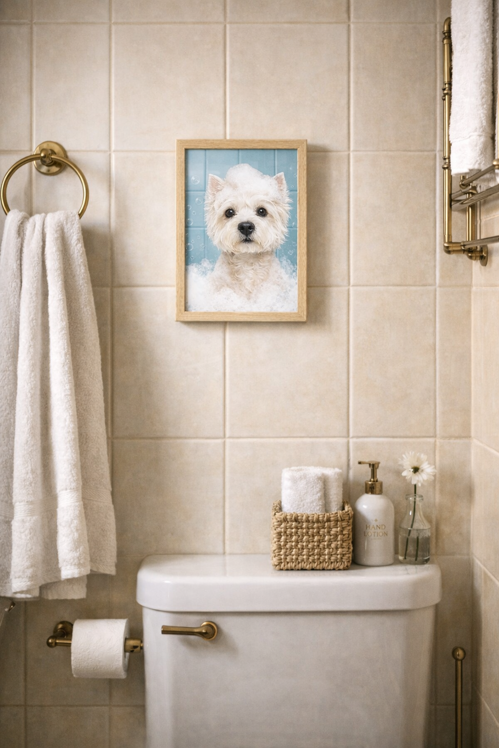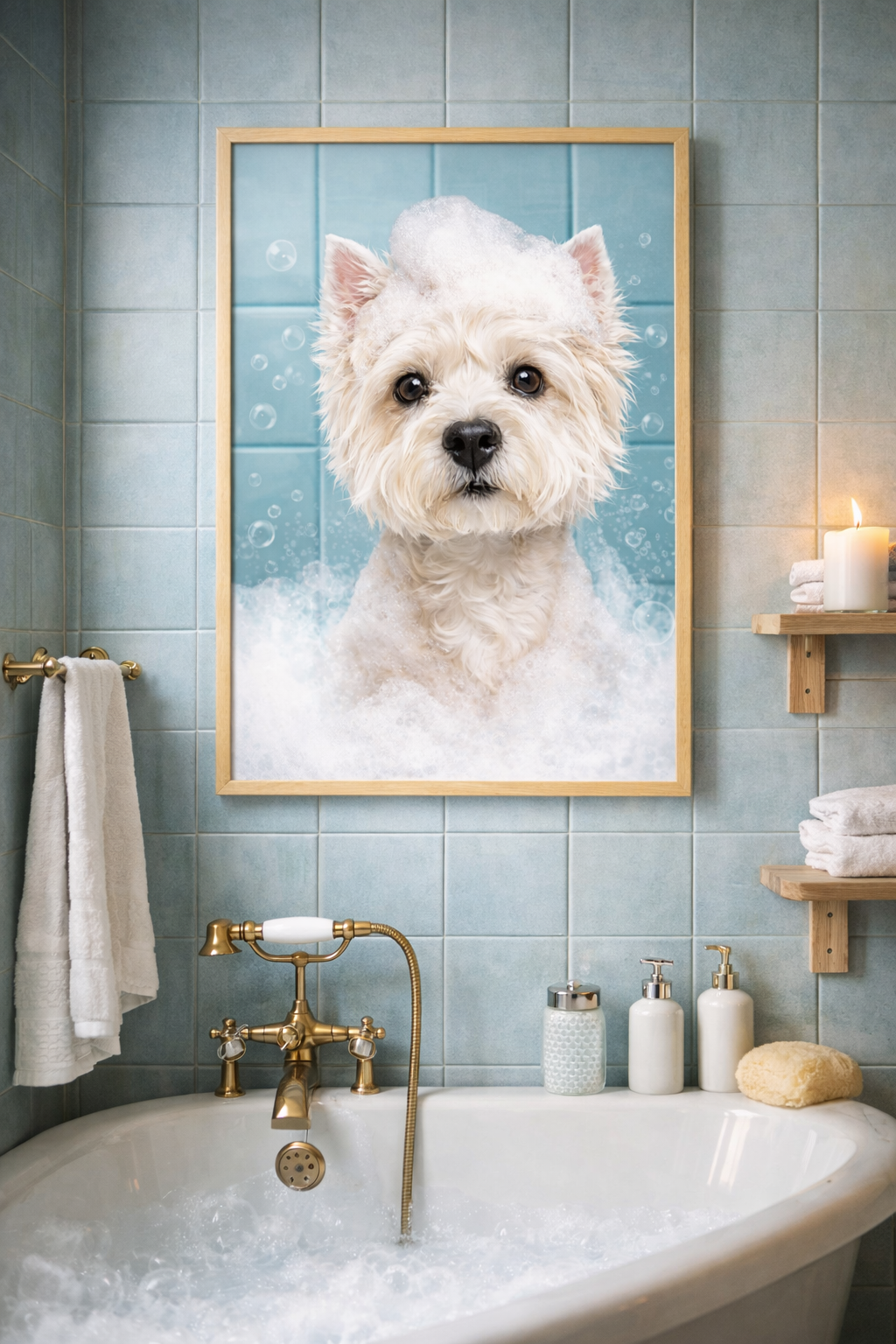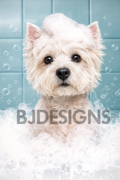 This adorable West Highland Terrier wall art features a sweet Westie enjoying a bubbly bath, complete with a fluffy foam “shampoo hat” and soft blue tile backdrop. It’s the perfect mix of charm, humour, and clean spa-style aesthetic for any bathroom space.