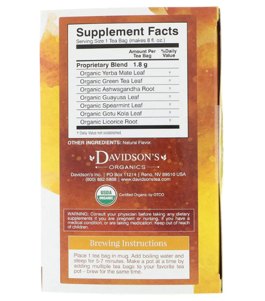 Organic yerba mate leaf, organic green tea leaf, organic ashwagandha root, organic guayusa leaf, organic spearmint leaf, organic gotu kola leaf, organic licorice root and natural flavor.