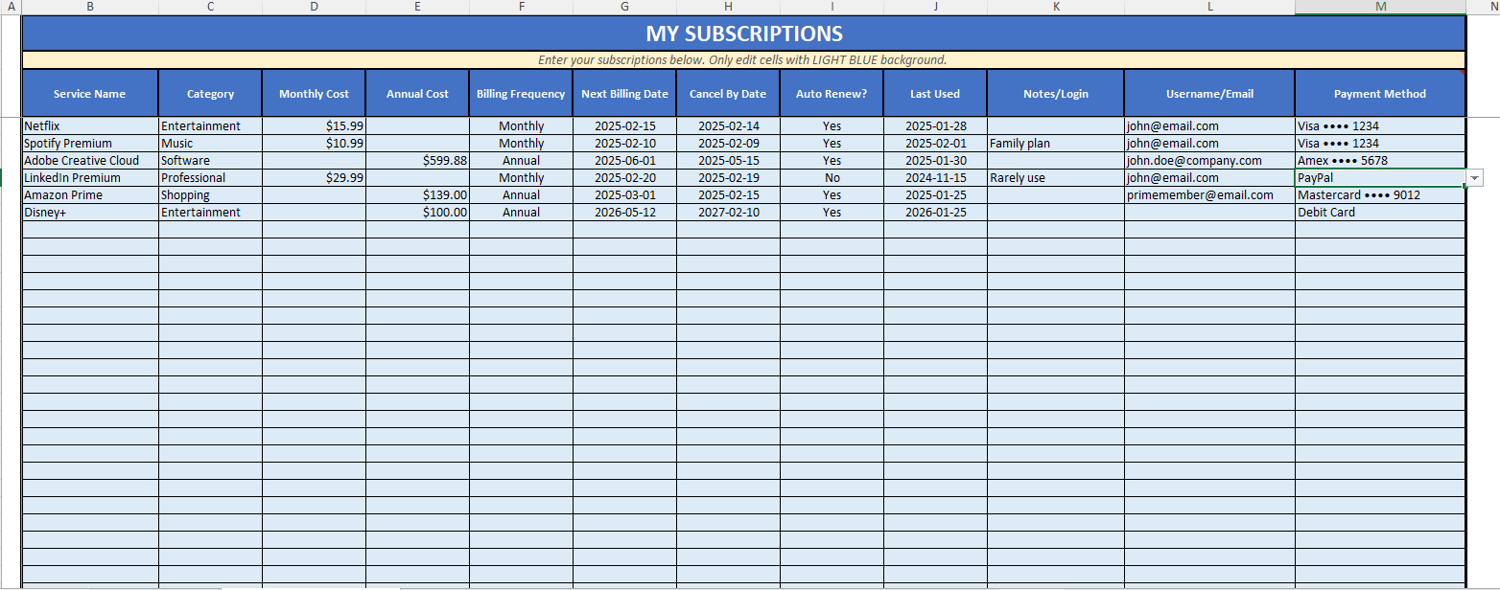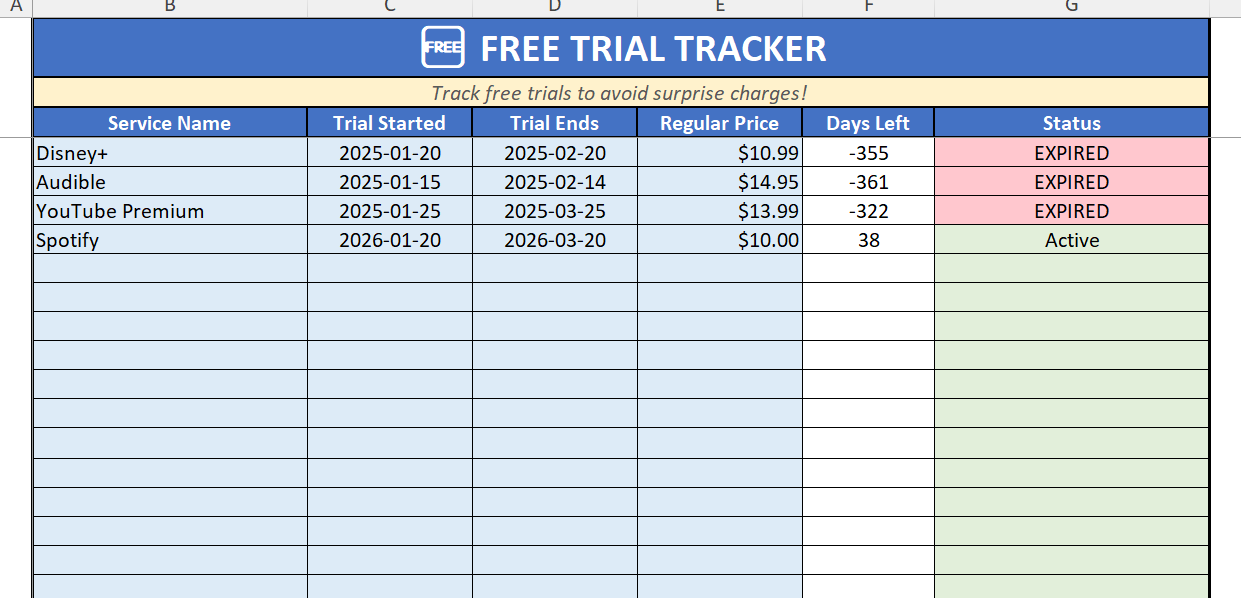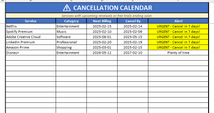 A simple Excel tracker to organize your recurring payments, avoid surprise charges, and never miss a cancellation deadline.