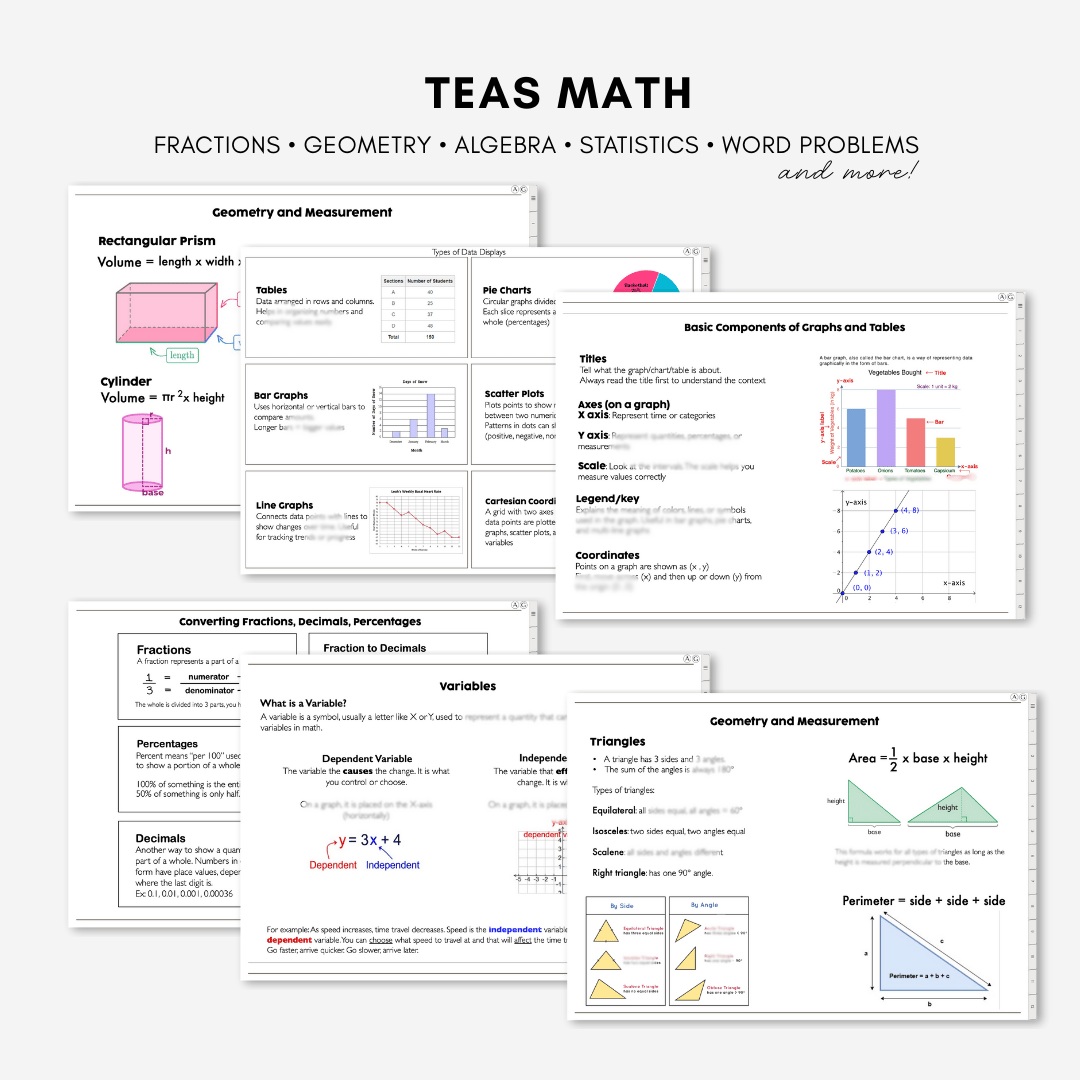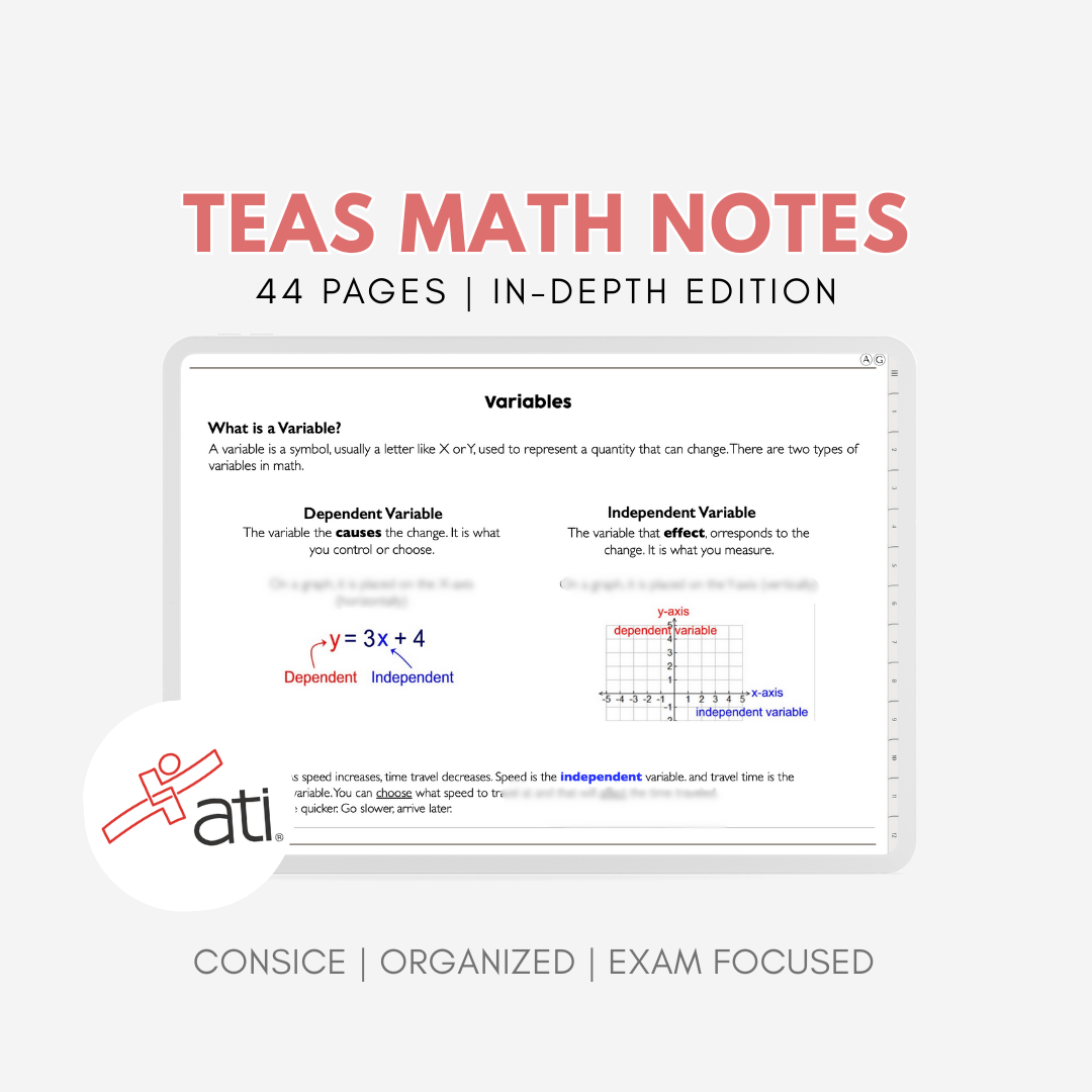 In-depth TEAS Math notes I created while studying for the TEAS exam. These notes are designed for longer study sessions and focus on the core math concepts tested on the TEAS. Organized by topic and breaks down problems step by step to help you understand how math questions are presented on the exam!