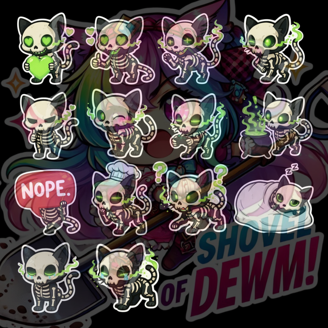 Meet the SkeleKitties! This pack features 14 unique stickers of a skeleton cat with a signature neon green glow. From gaming and cooking to the "NOPE" bubble, this set covers all your digital mood needs.