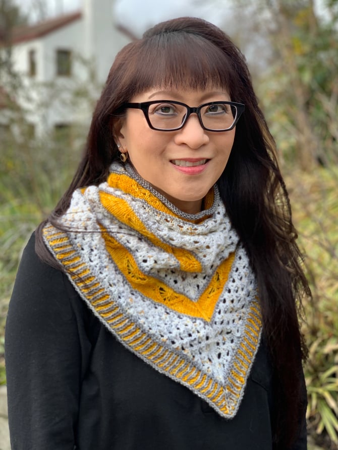 Honey Bee Mine is a cozy three-color bandana cowl that features sweet honeybees flitting among the honeycombs. The cowl looks like a triangular shawl when worn, but it needs no fussing or pinning to remain stylishly in place.