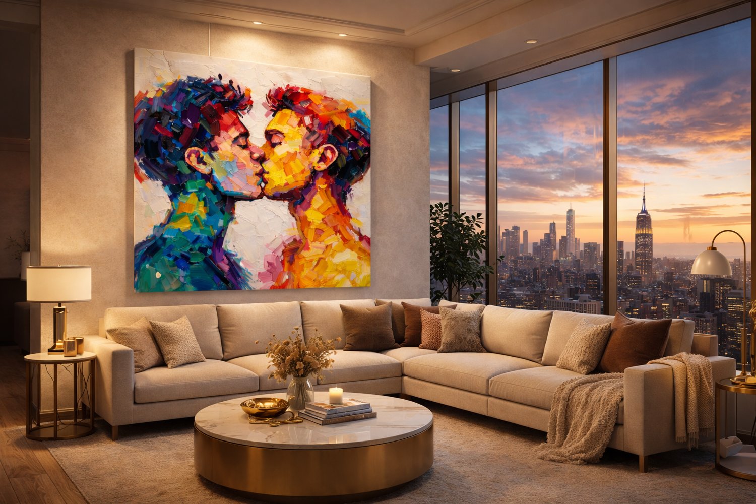 This vibrant LGBTQ wall art digital download captures an intimate moment between two men in a bold, textured palette knife painting style. Bursting with rich rainbow tones, expressive brush strokes, and modern abstract energy, this artwork makes a powerful statement about pride, connection, and authenticity.