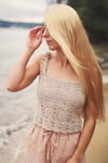 Monoi top is a partly lined, cropped top with gathered straps with an elastic inside, and decorated with sophisticated lace patterns. The top is a tube, worked in one piece bottom-up. The straps are a worked separately. A narrow elastic is pulled through the tunnel to gather the strap. The straps are attached to the top using working yarn and a tapestry needle at the very end. The pattern includes a detailed, step by step tutorial on how to do this.
