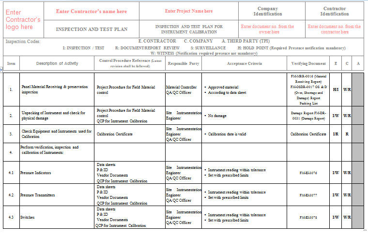 This document provides a general comprehensive template for the Inspection and Test Plan for Instrument Calibration used at construction sites.