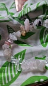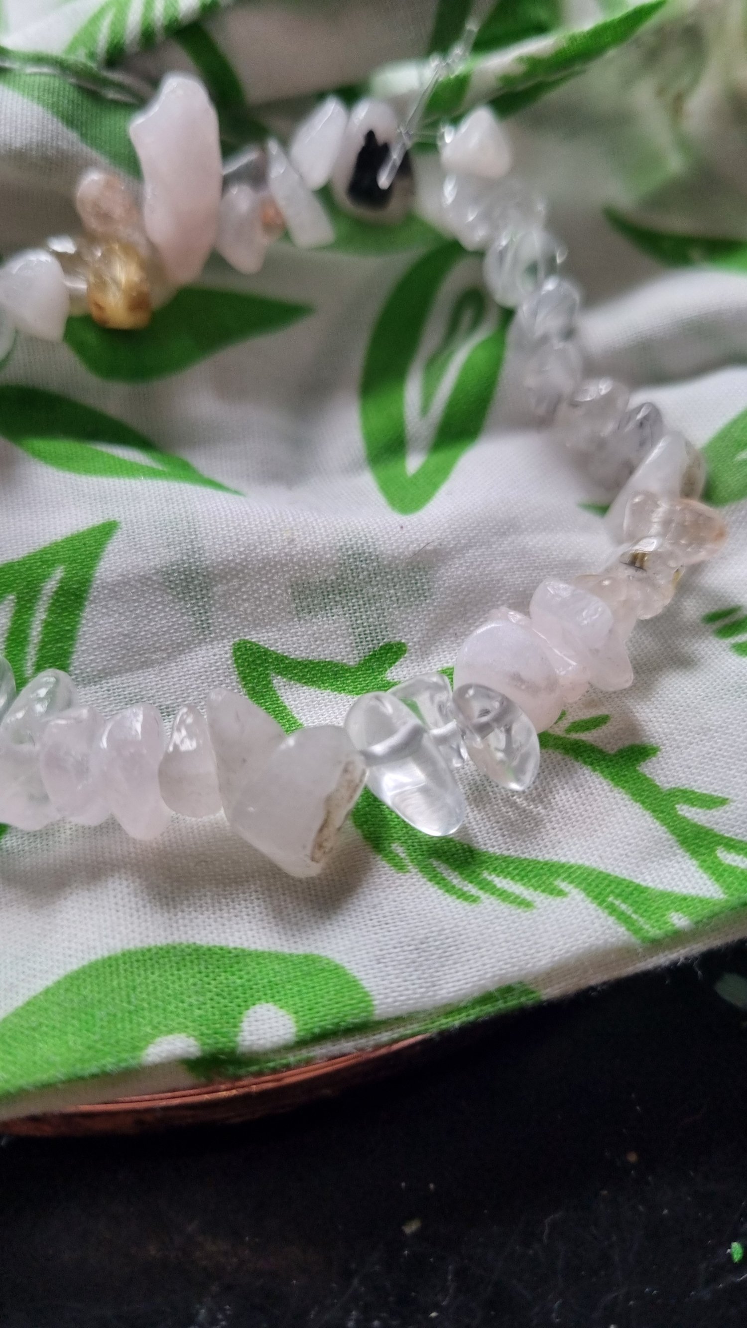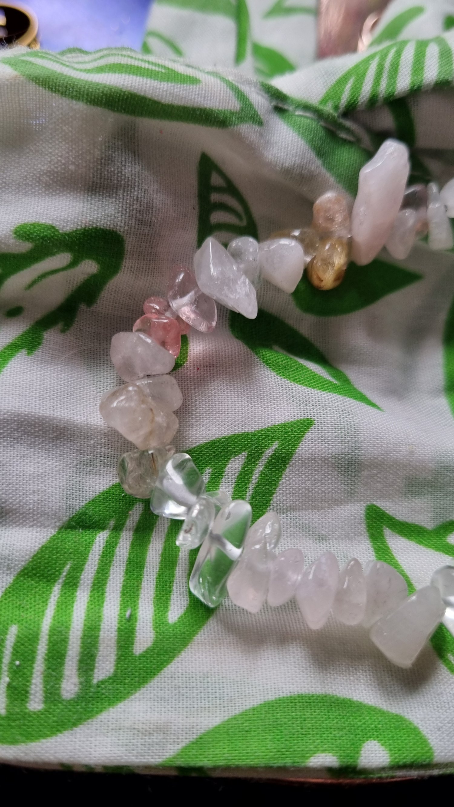 This delicate crystal chip bracelet is strung on a durable clear elastic base, making it comfortable and easy to wear every day. Featuring a stunning mix of Strawberry Quartz, Rose Quartz, Clear Quartz, and Smoky Quartz, this piece is not only beautiful but also filled with positive energy: