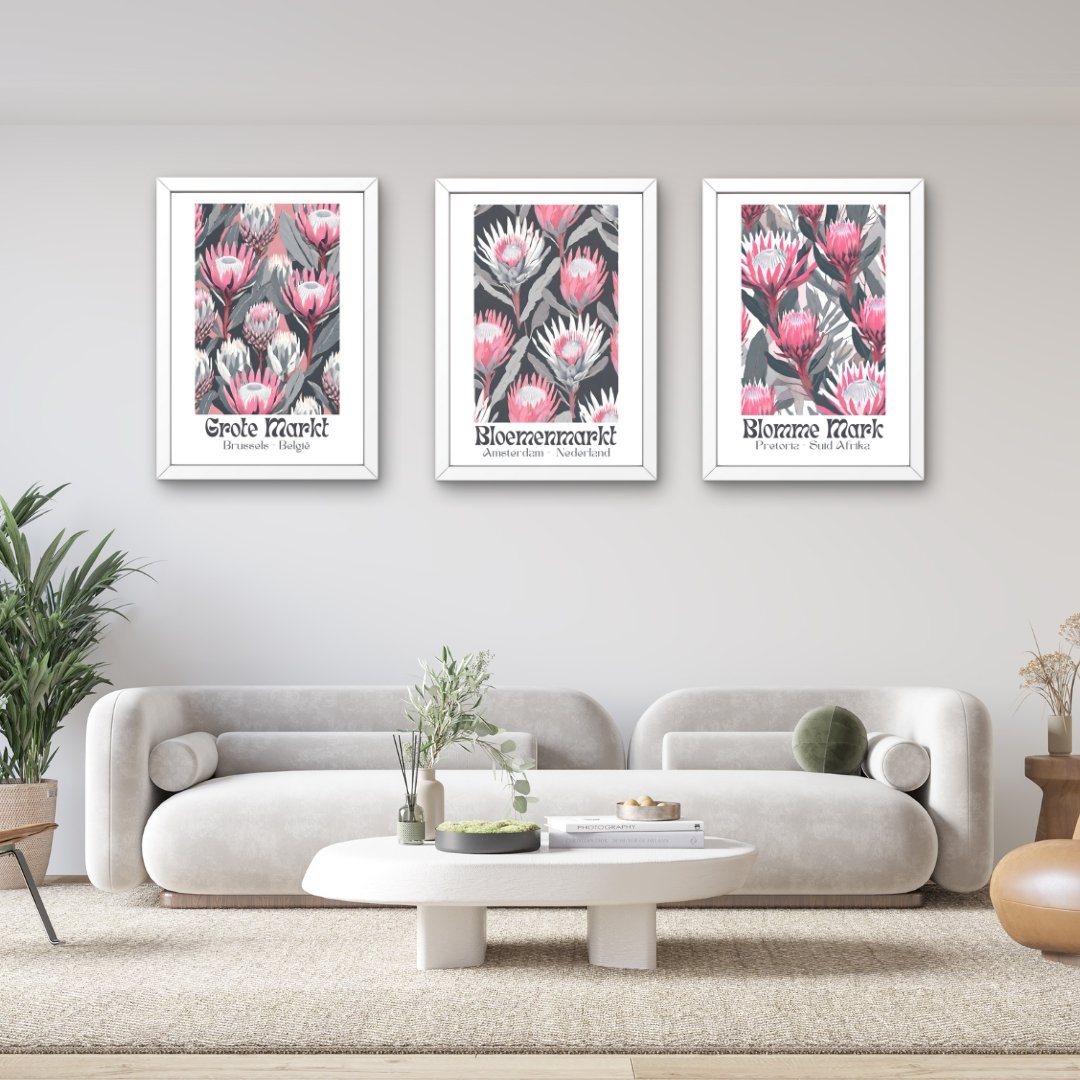 Introducing an exquisite set of three printable wall art pieces, specially designed for individuals who adore the distinctive beauty of proteas. These abstract designs were created using the power of AI technology, resulting in a truly unique and visually stunning artwork. The colorful and vibrant digital prints are guaranteed to elevate the decor of any living space, bringing a touch of elegance and sophistication to your walls. These wall art pieces are perfect for those who appreciate the finer things in life and want to add a touch of artistic flair to their surroundings.