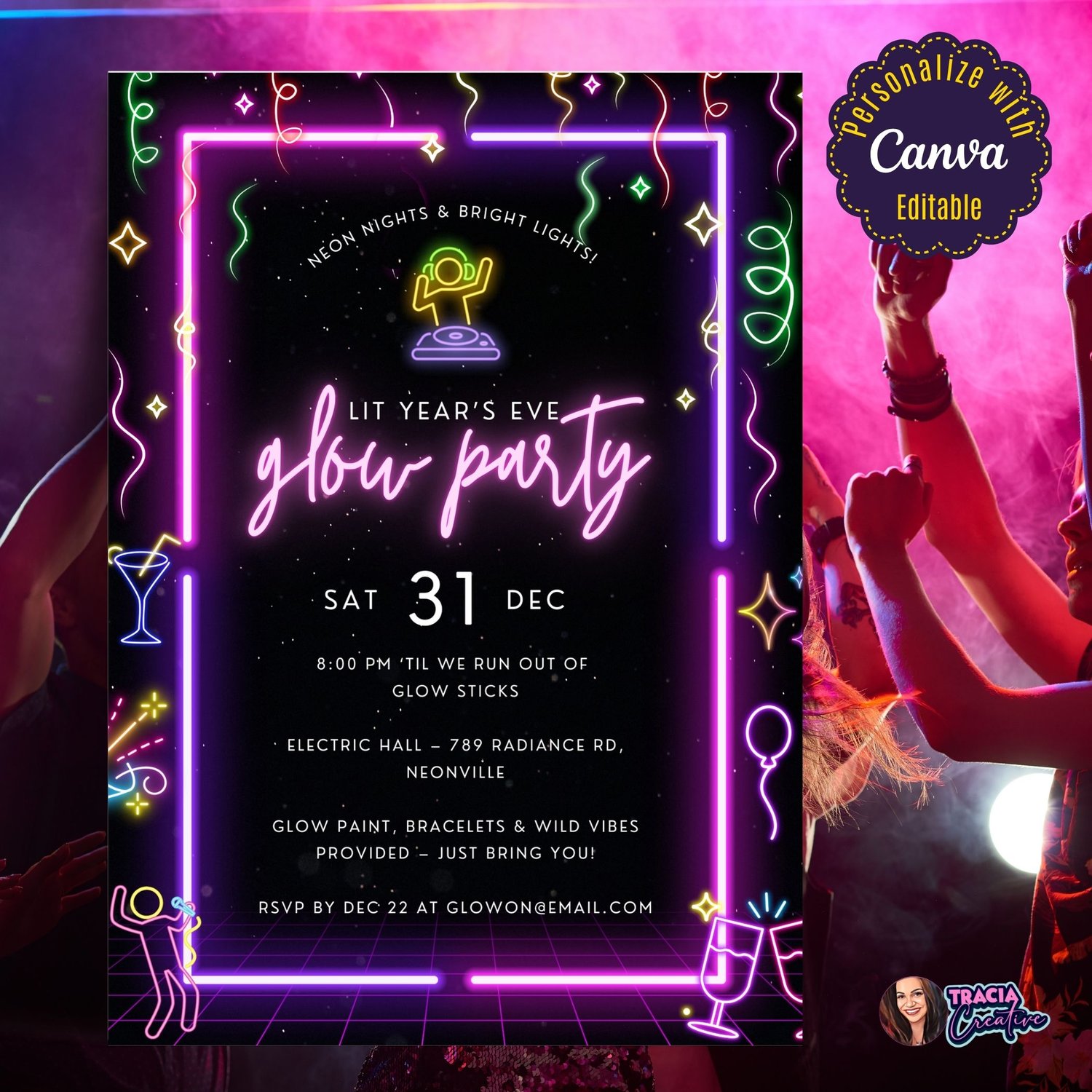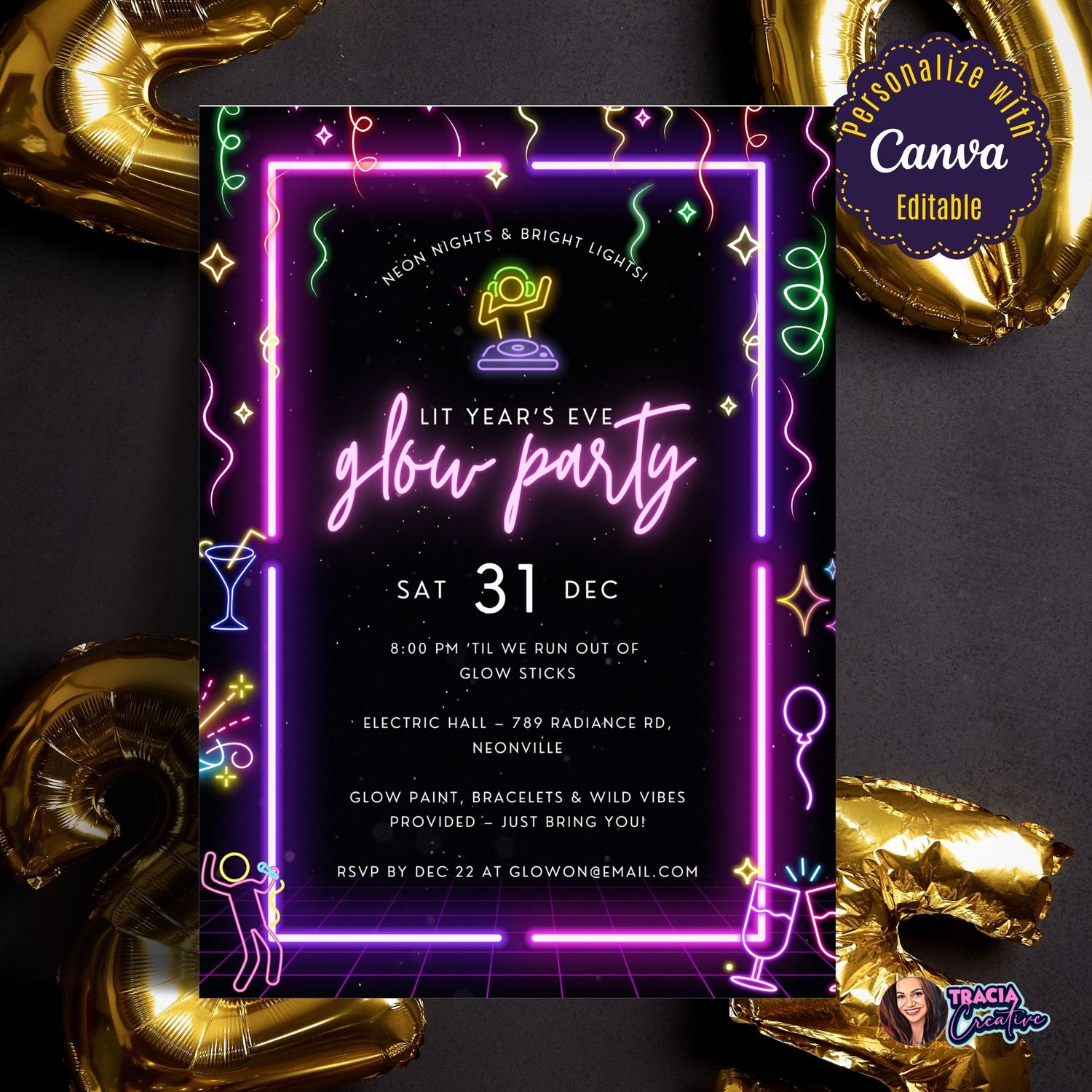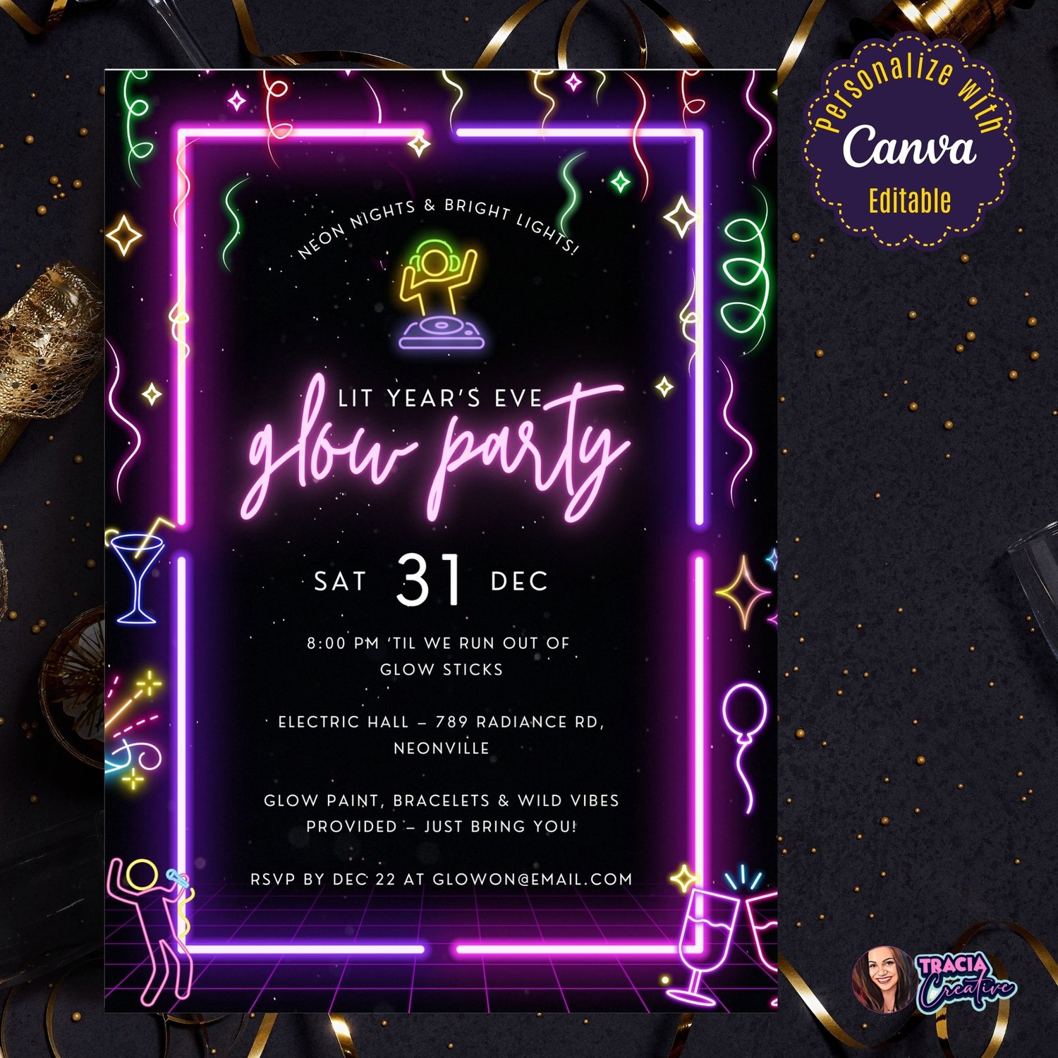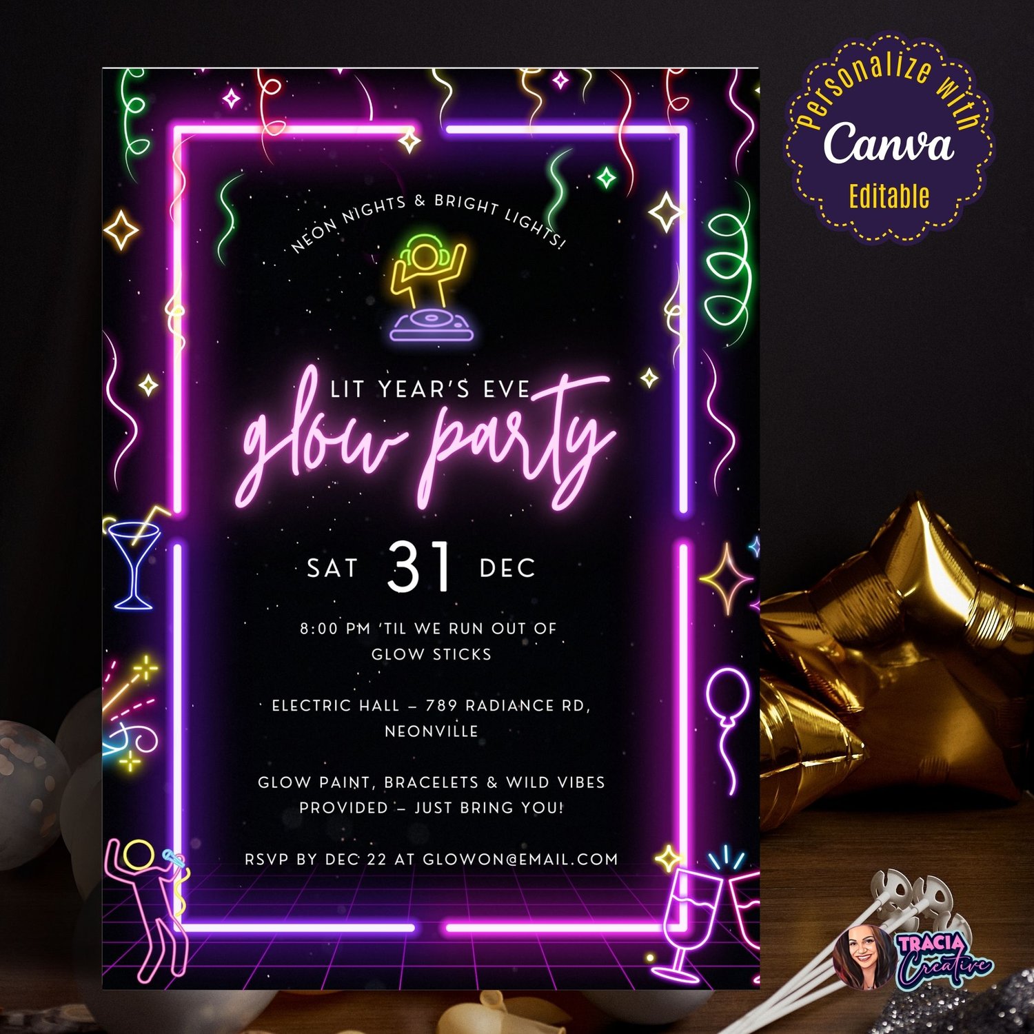 Lit New Year's Eve Glow Party Invitation – Editable Canva Design