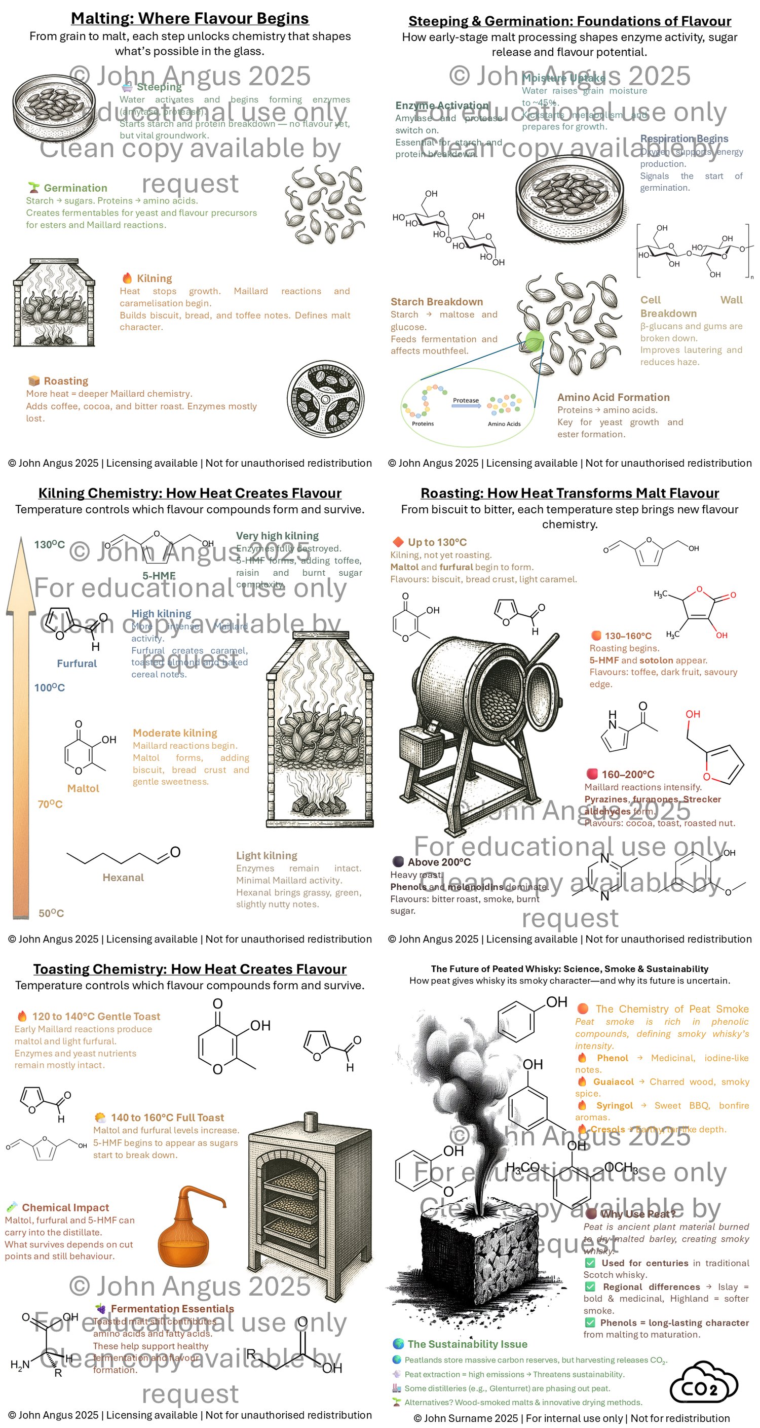 - Kilning, roasting, peating and toasting → flavour and colour formation