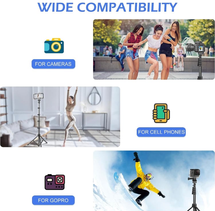 - What You Get: 1X Phone Stick Tripod; 1X Universal Phone Holder; 1X GoPro Adapter; 1X Bluetooth Remote Shutter.