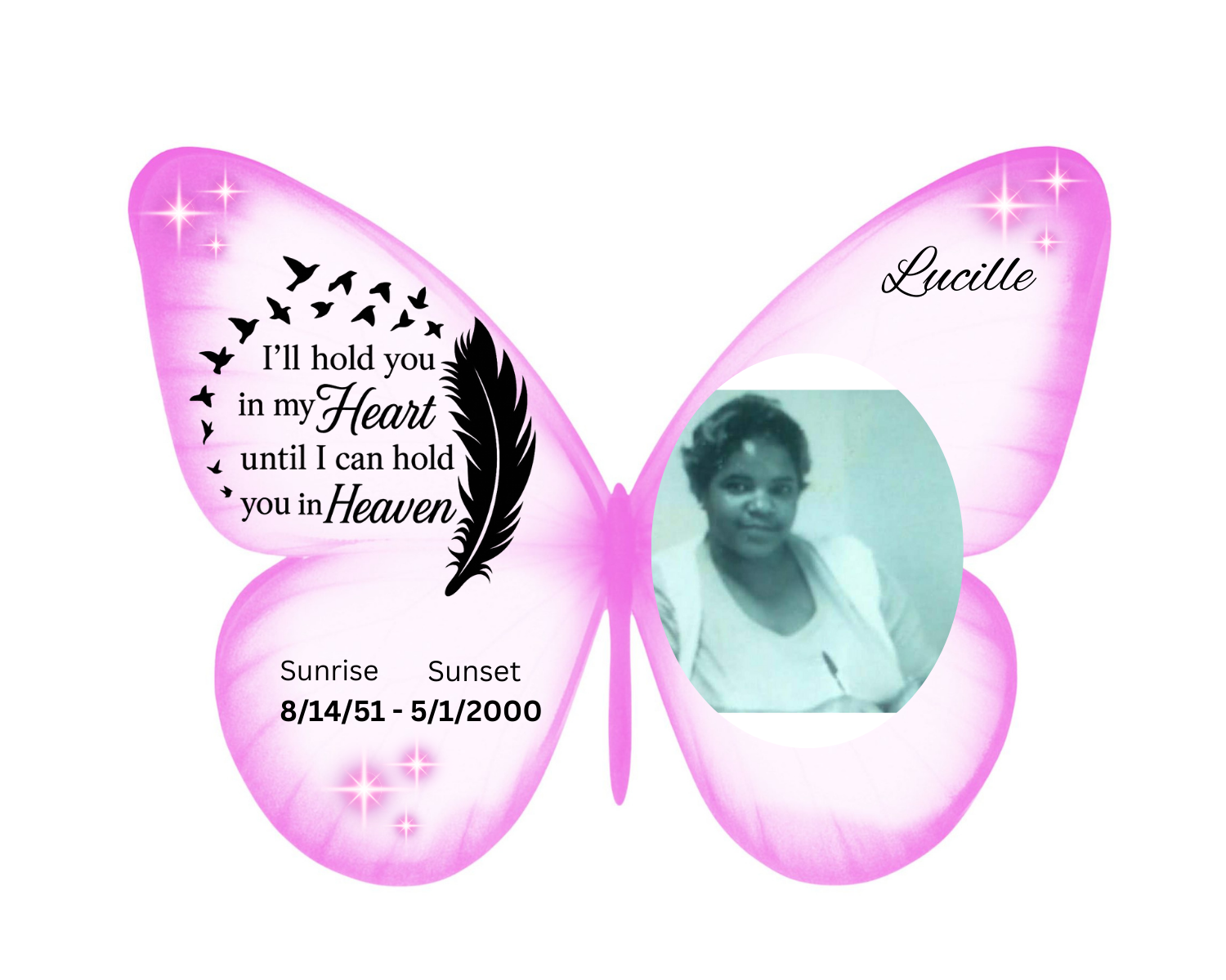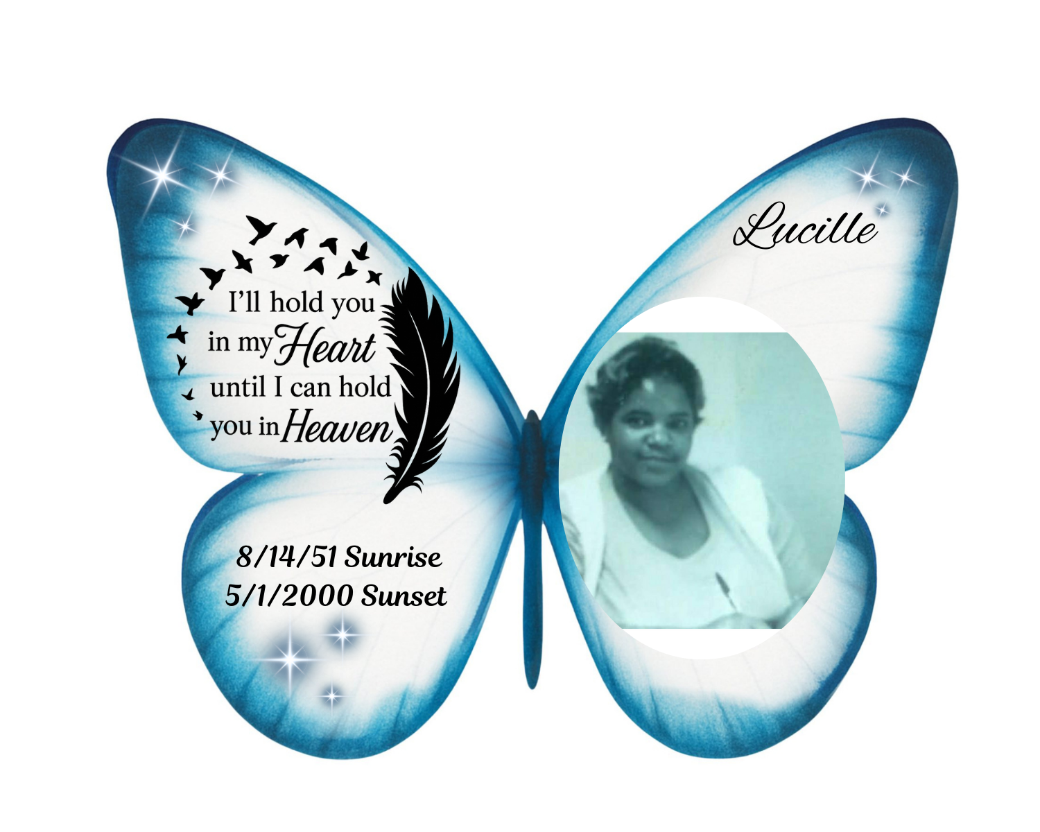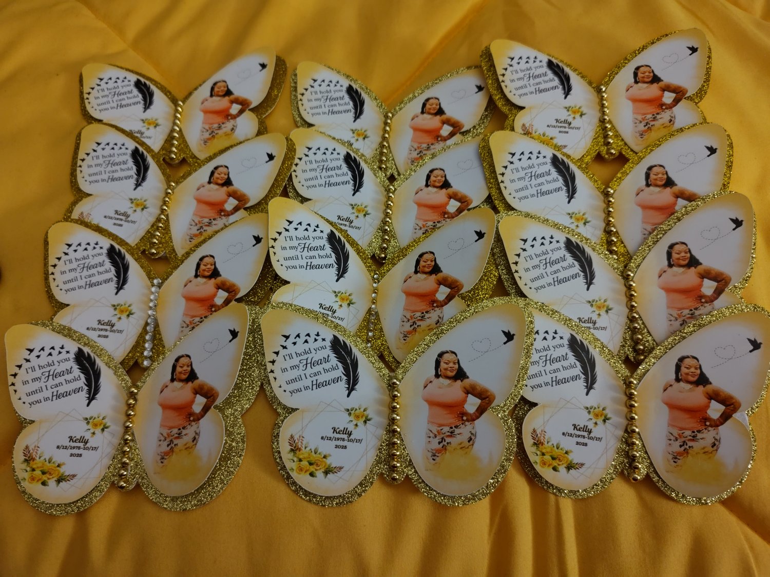 Twelve 2 Layered butterfly memorial pendants in your choice of color with your loved one picture, name, short poem, sunrise and sunset date.