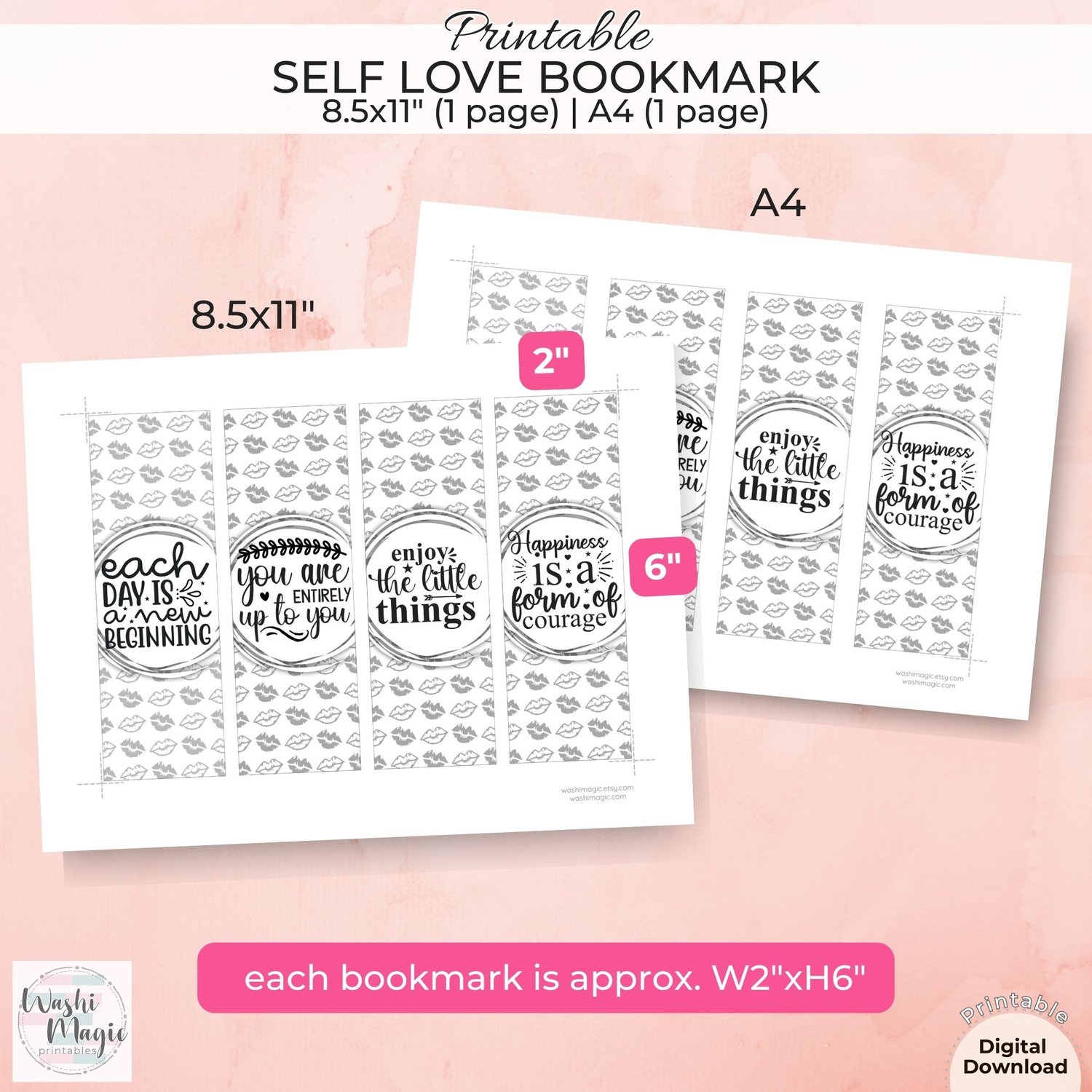 The size for each bookmark is slightly bigger 2.1"x 6.2" while designing. You may trim it down to 2"x6" or simply follow along the line to cut.