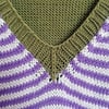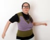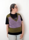 La musica e il testo di Stripsearch dei Faith no More, misteriose e inquietanti, si accordano con le emozioni vissute durante le settimane della quarantena qui a Milano, a ridosso dell’epicentro italiano dell’epidemia di Covid-19. Lavorare a questo gilet mi aiutava a rilassarmi. Il motivo a strisce aiuta a tenere desta l’attenzione senza complicare il lavoro. Il gilet si lavora top down a partire dalle spalle, il davanti ha la sezione a righe più alta, mentre sul destro una leggera sagomatura in vita gli dà maggiore forma (il davanti non è sciancrato). La costruzione top down rende possibile variare la lunghezza del gilet. Io ho lavorato la taglia M e, nella lunghezza indicata, ho terminato senza avanzi con 3 gomitoli di colore A. Il filato usato è Nordica di Sesia, una lana merino pura superwash che si rilassa abbastanza con il lavaggio, tenete presente questo nel lavorare il capo con il filato originale. Dato che il gilet è stato creato con avanzi, sentitevi libere di modificare lo schema dei colori, usandone uno solo o sviluppando differentemente le strisce.