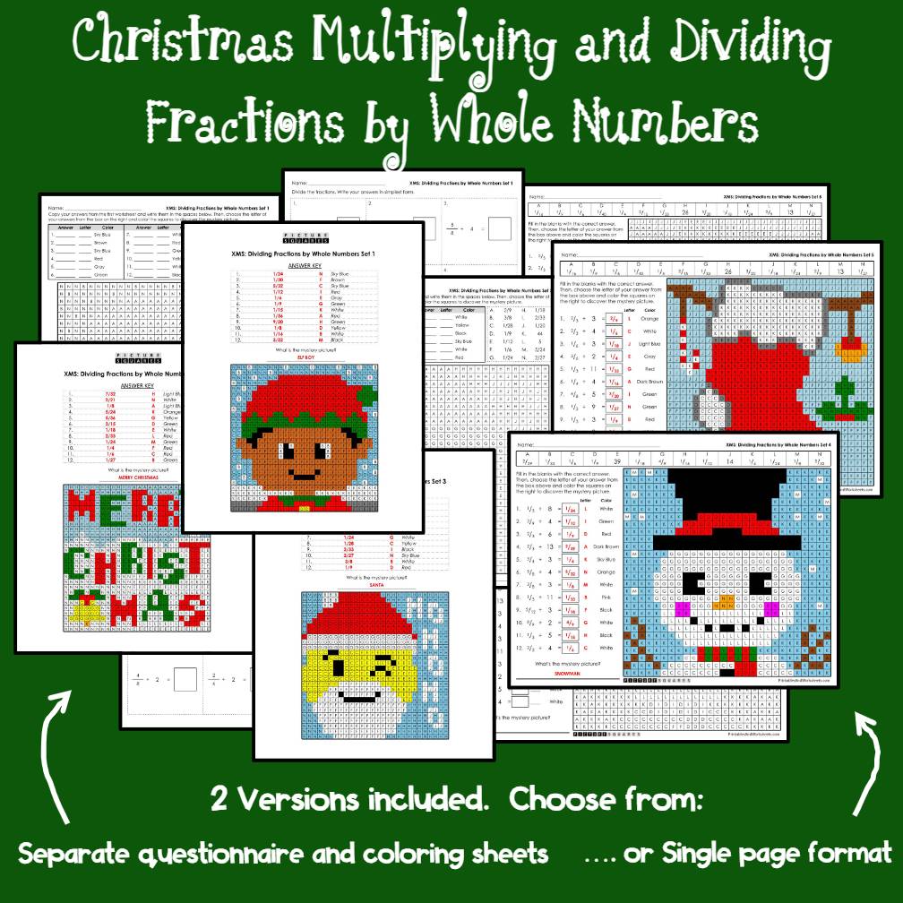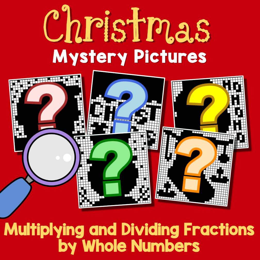 These color-by-code mystery picture activities help students review multiplying and dividing fractions by whole numbers—all while coloring to reveal cheerful holiday images.