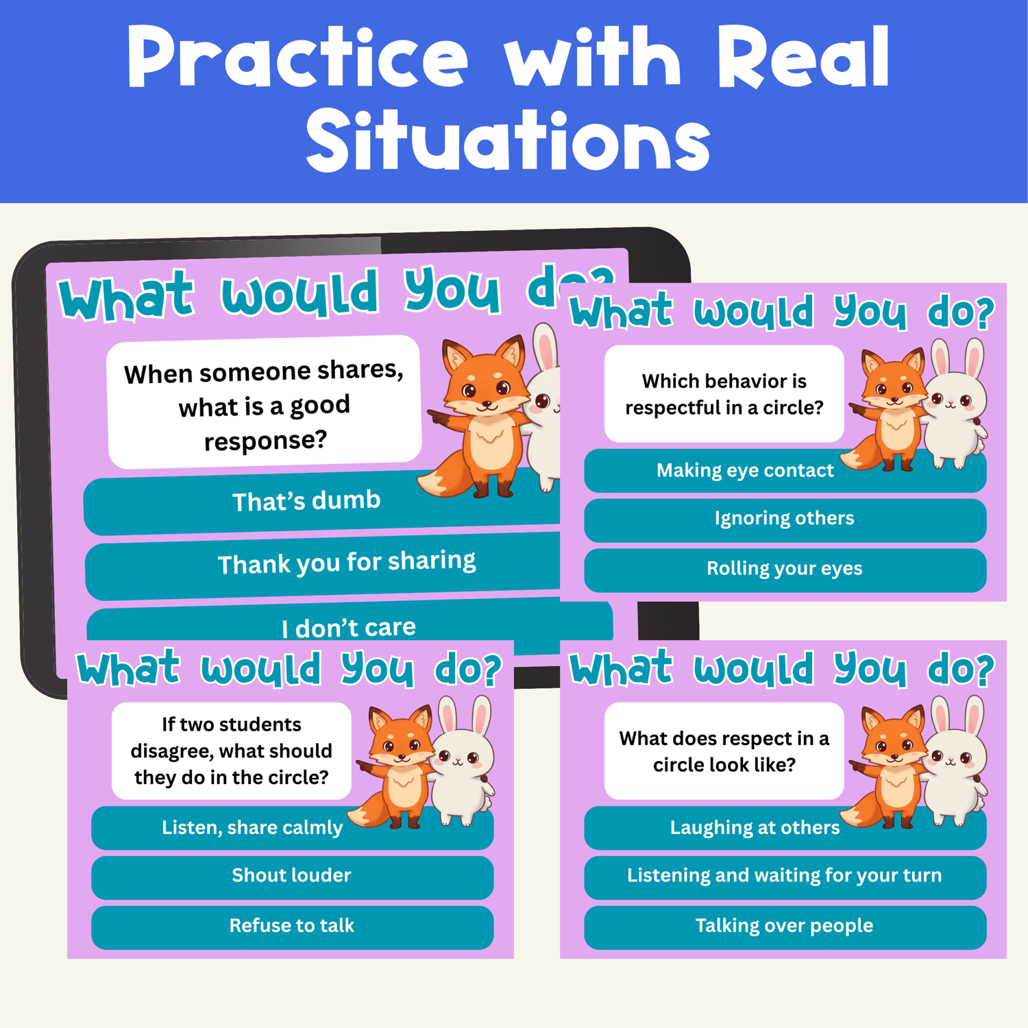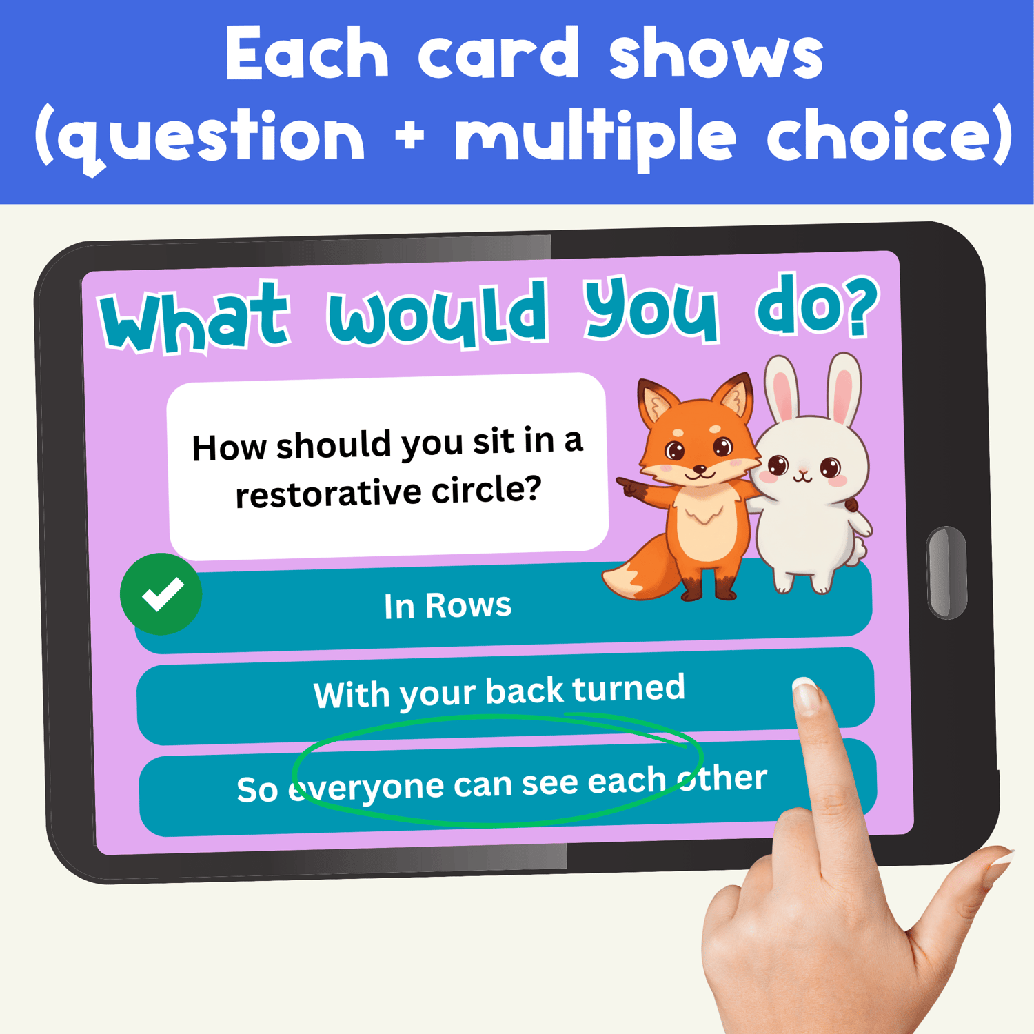 This Boom Cards™ deck introduces students to the purpose of restorative circles and guides them through how to participate respectfully. 👫 The cards include clear examples, friendly characters 🐰🦊, and interactive practice that make restorative practices simple to teach and engaging for learners.
