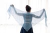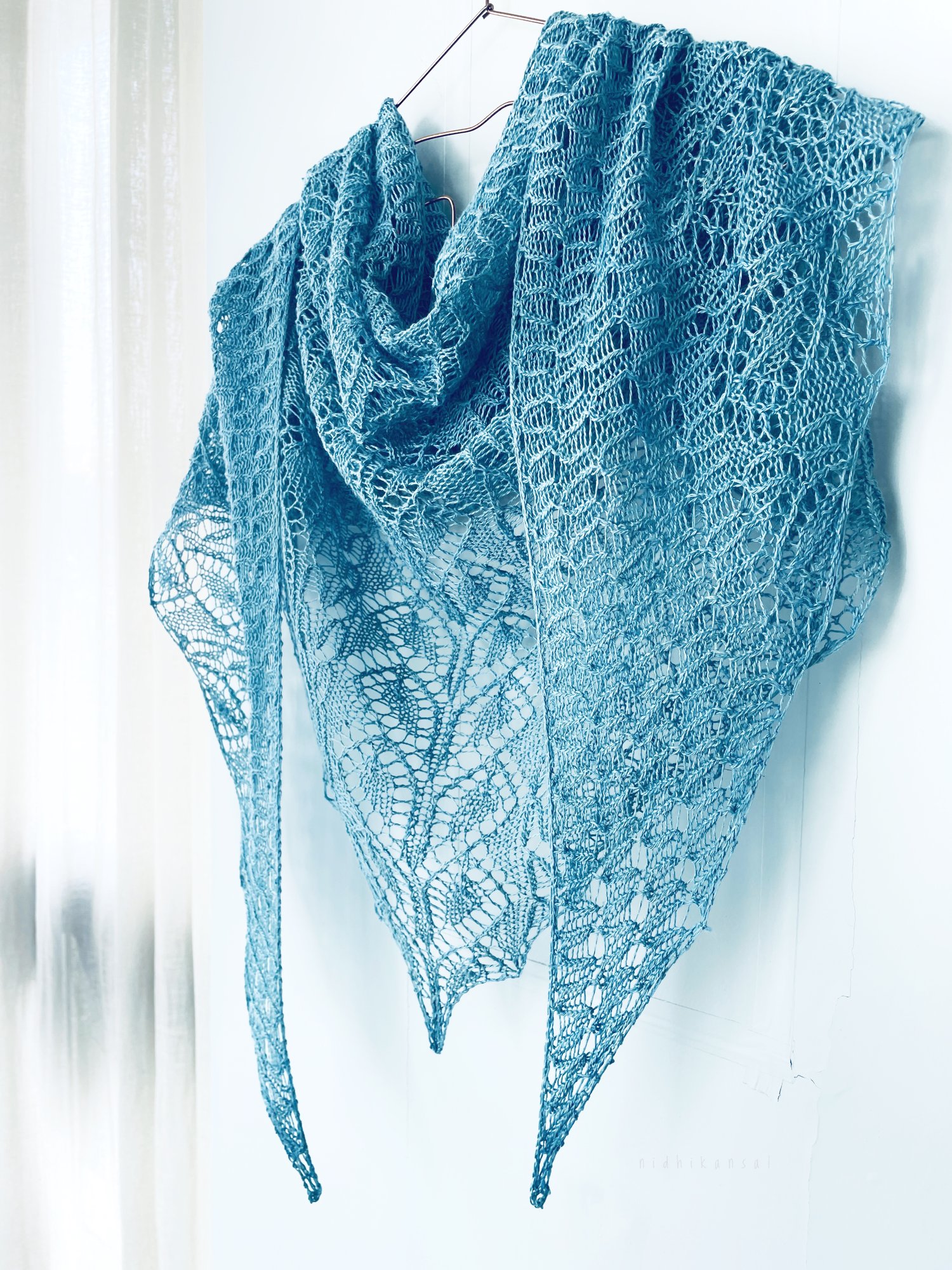 Arth is a lacy triangular wrap knit in one piece. Worked from the bottom up, the lace panels grow out evenly into the body of the shawl ending with a broad twisted rib and lace border.