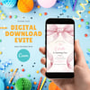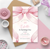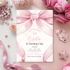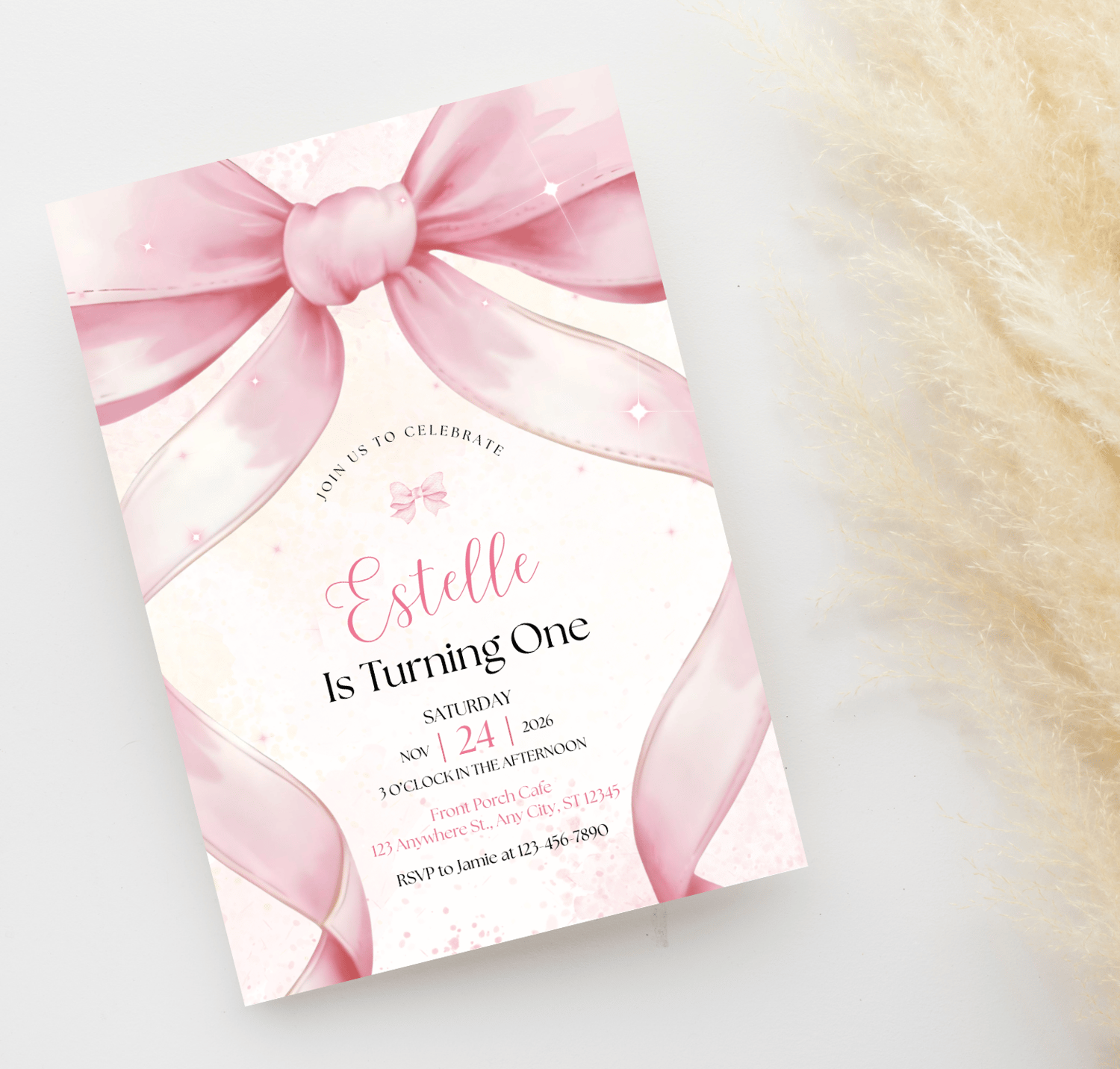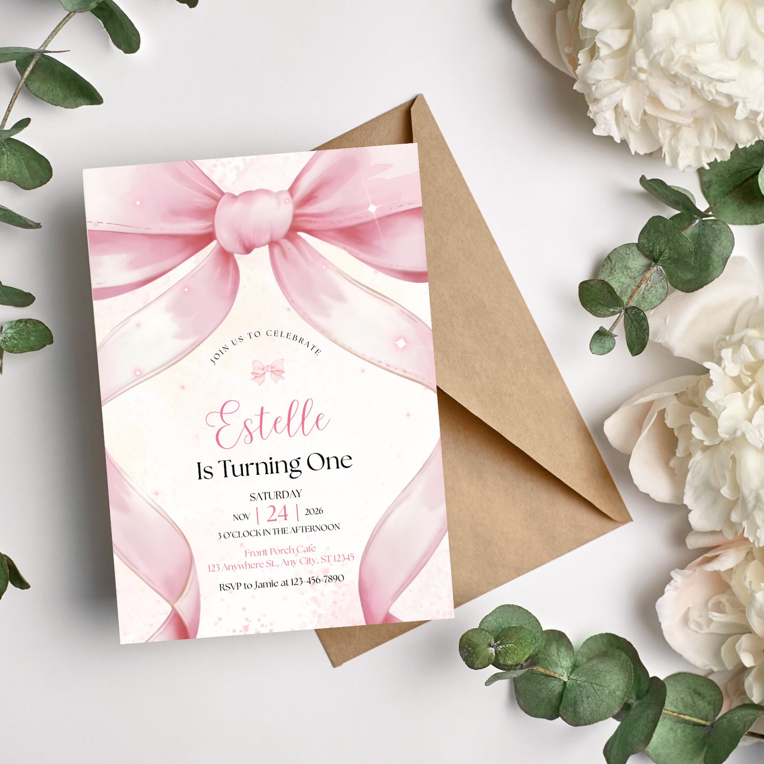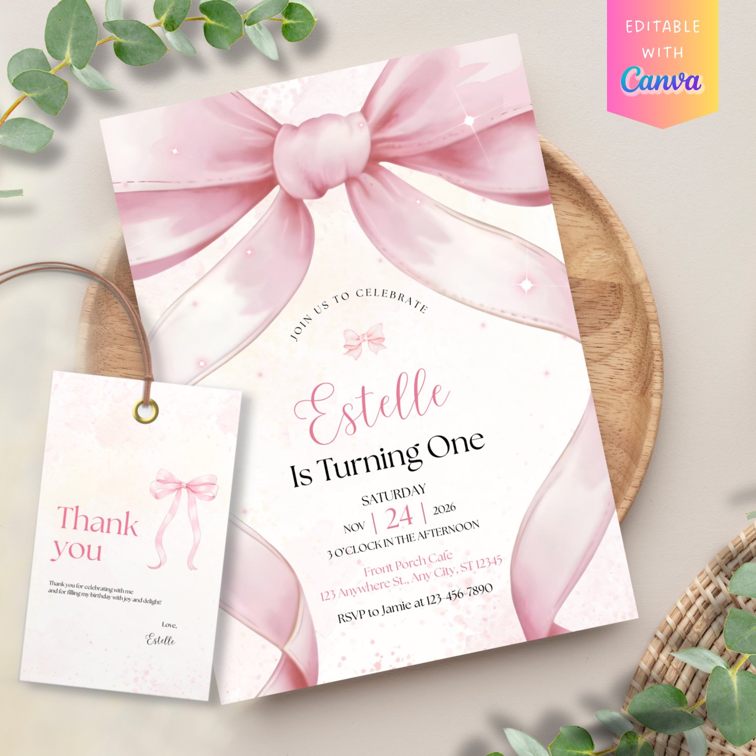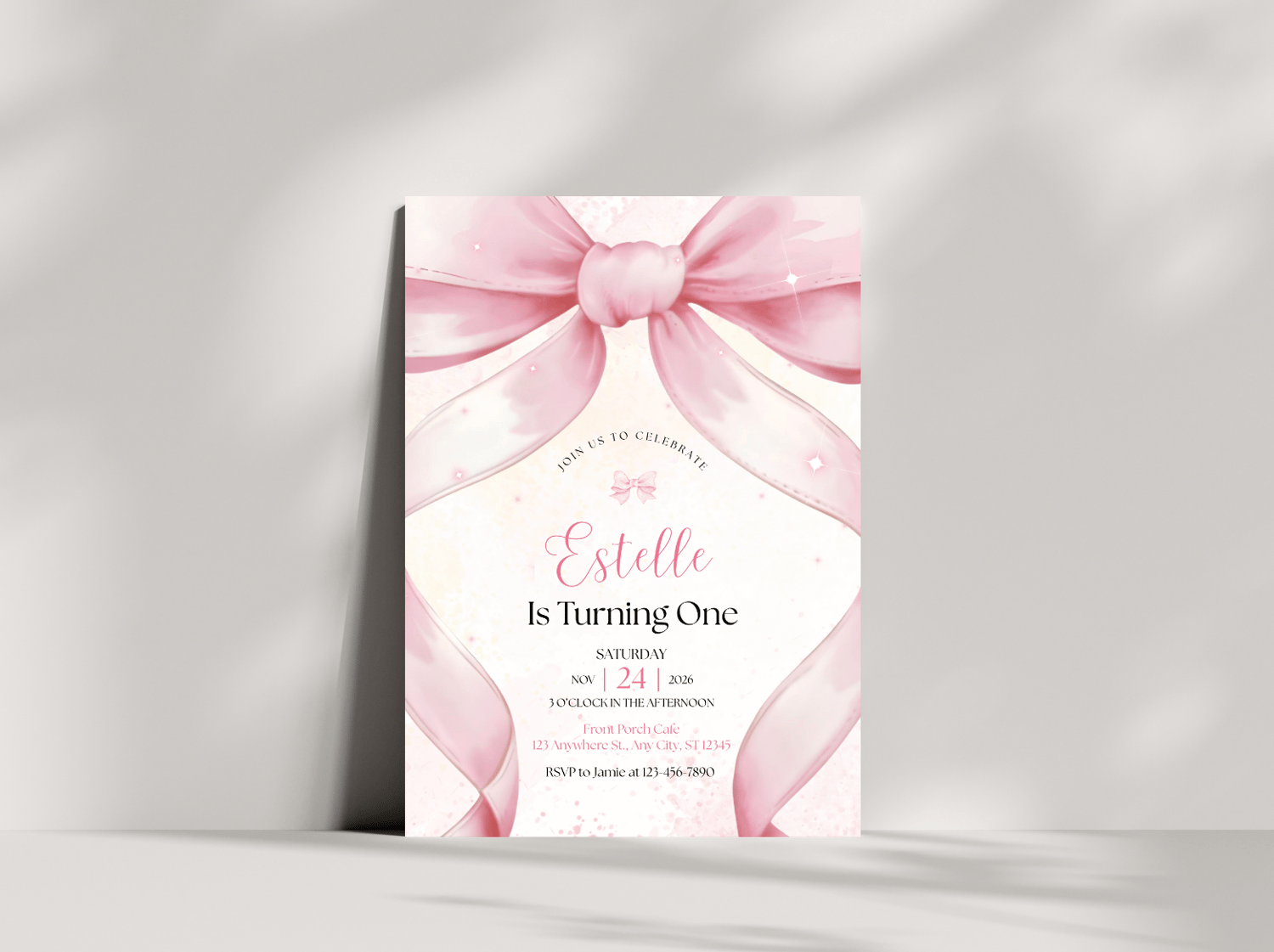 Pink Bow Birthday Invitation, Girl Pink Birthday Invite, Coquette Pink Bow Invitation, Pink Girl Ribbon Digital Invitation, 5x7 Canva Digital Download