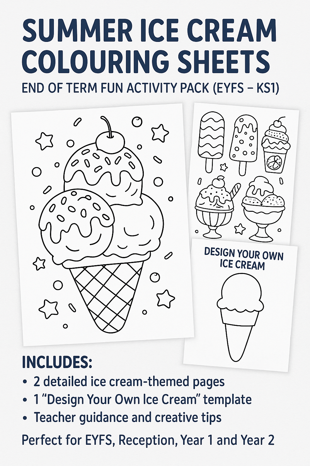 Celebrate the end of term with this delightful Summer Ice Cream Colouring Pack – perfect for Early Years and KS1 learners! This fun printable activity includes a selection of ice cream-themed colouring sheets, ideal for calming classroom moments, golden time, or early finishers.