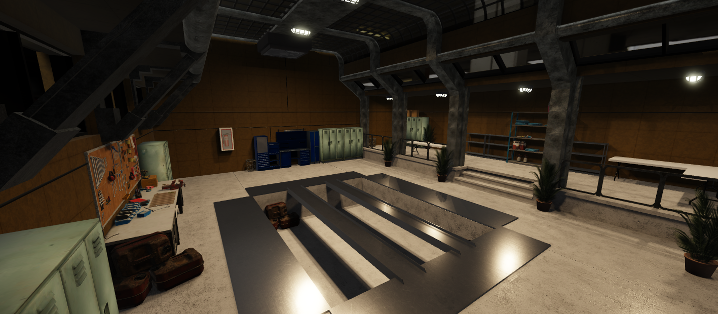 A sleek, industrial-grade facility designed for maintaining and housing military vehicles. Features reinforced structures, advanced lighting, and organized workstations, combining military functionality with a modern aesthetic.
