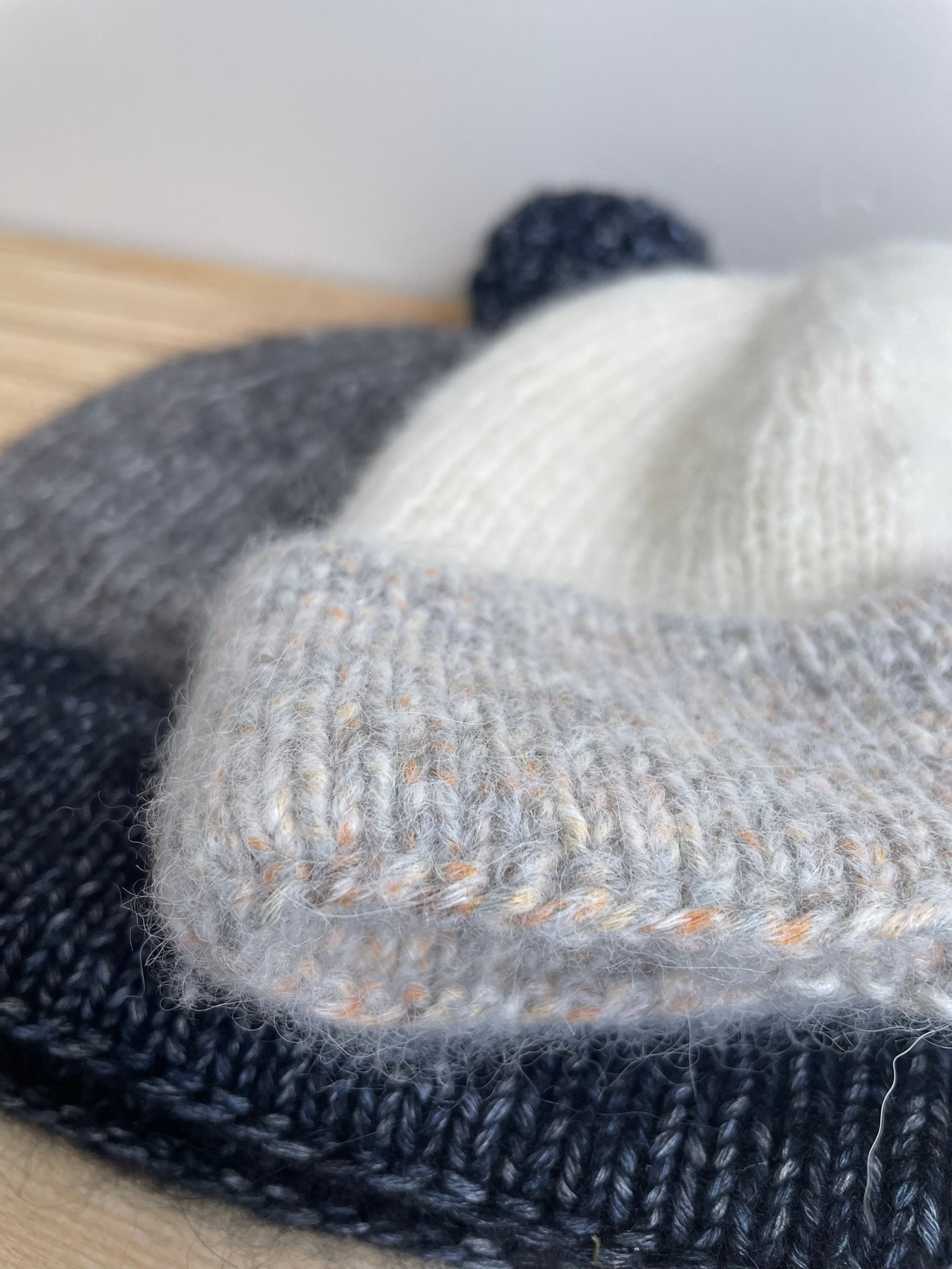 This beanie features a triple folded brim with a scalloped edge decoration. Two versions are available, one with big scallops and the other with tiny scallops if you prefer something more subtle. It is worked from the brim to the top. The crown length can be modified depending on if you like to have more or less room on top of your head.