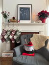 Samples are knit in Barrett Wool Co. Wisconsin Woolen Spun Worsted (100% American wool; 250 yds / 228 m per 100g skein). For four stockings, CC (white): Birch – 4 skeins, MC (red): Jam – 2 skeins, MC (green): Laurel – 2 skeins