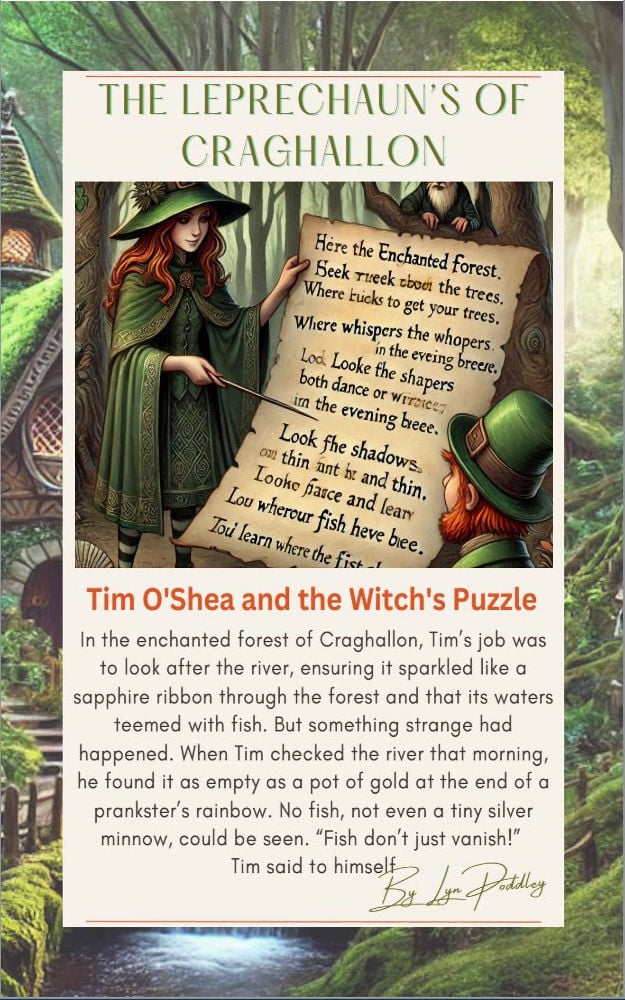 In the enchanted forest of Craghallon, Tim’s job was to look after the river, ensuring it sparkled like a sapphire ribbon through the forest and that its waters teemed with fish. But something strange had happened. When Tim checked the river that morning, he found it as empty as a pot of gold at the end of a prankster’s rainbow. No fish, not even a tiny silver minnow, could be seen. “Fish don’t just vanish!”