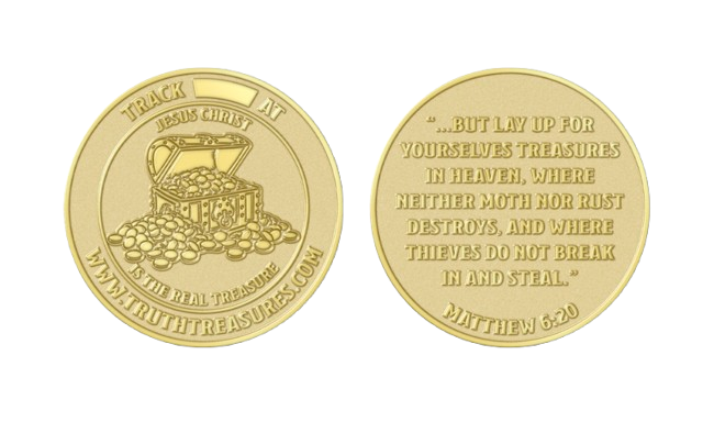 This beautifully crafted Truth Treasures coin features a golden chest overflowing with coins and the words “Jesus Christ — The Real Treasure.” The front invites you to “Track It” at TruthTreasures.com, connecting each coin to a greater story.