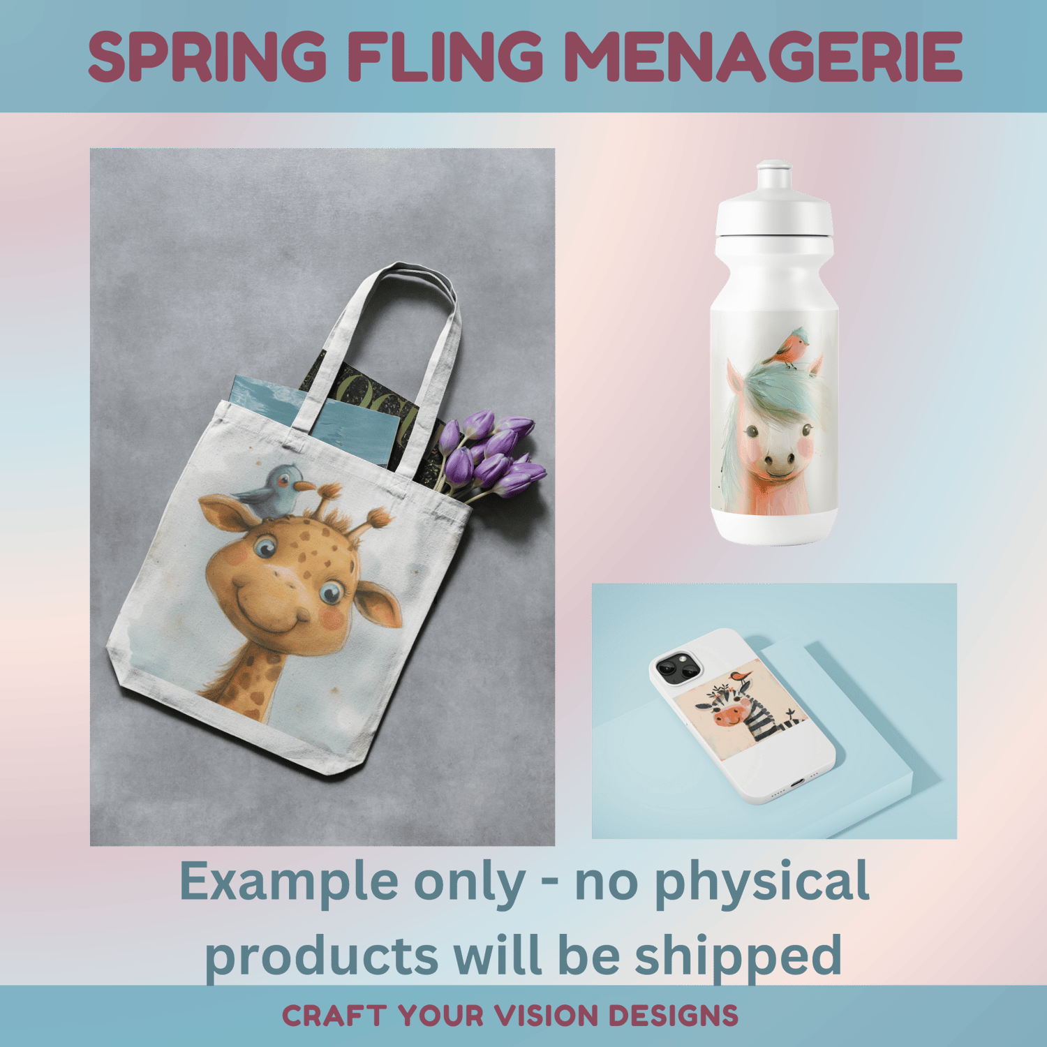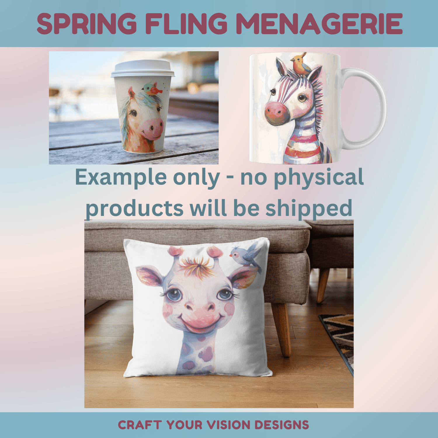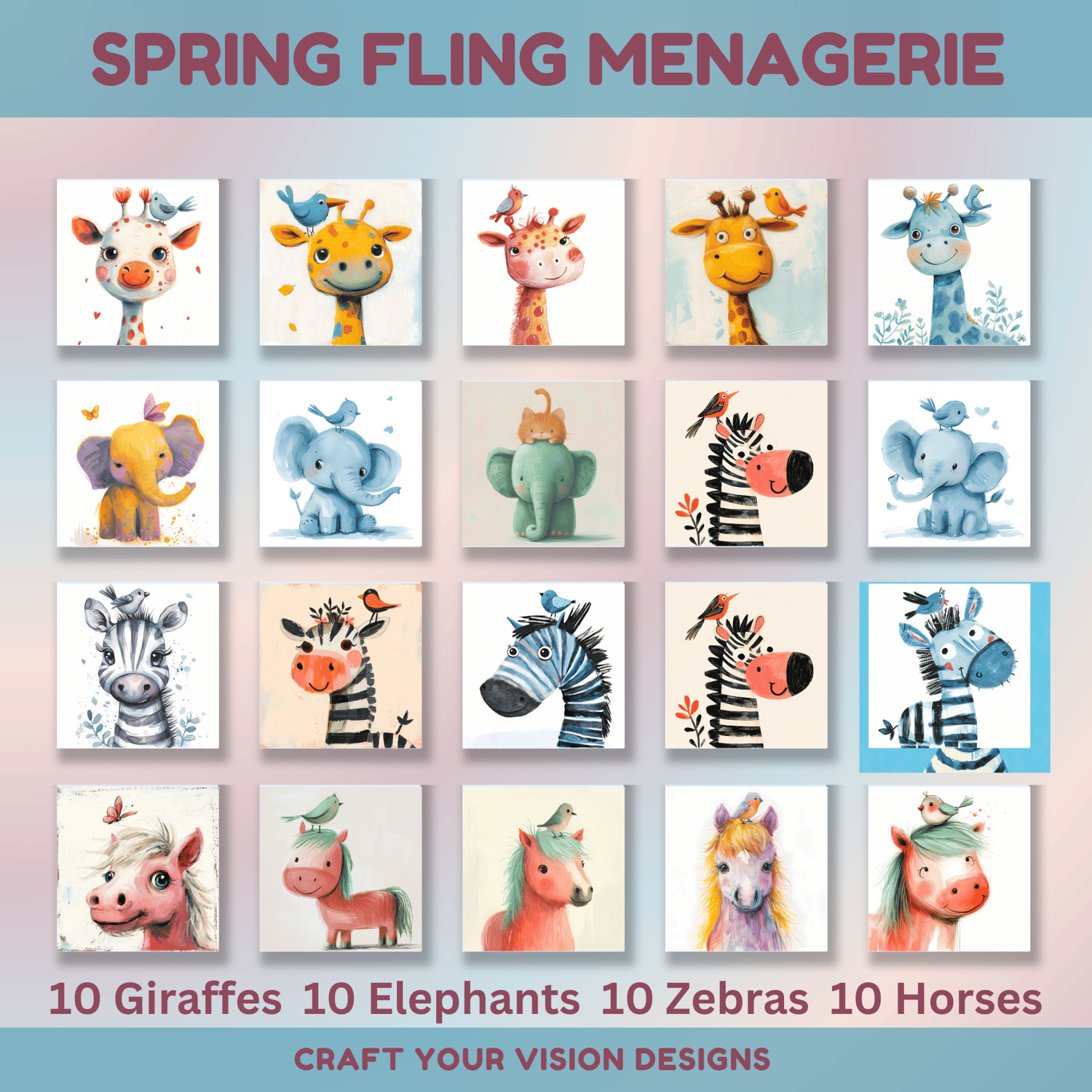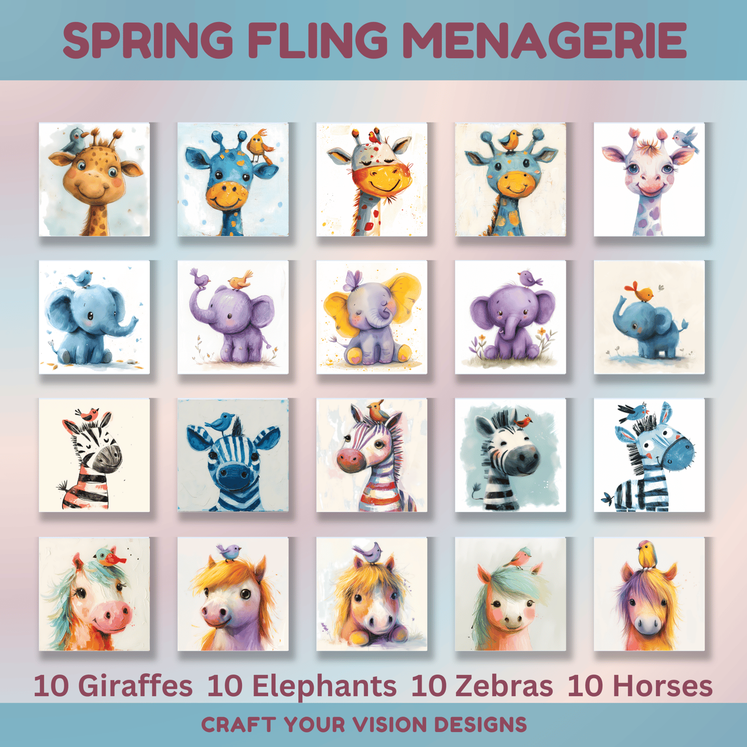 Introducing our delightful “Spring Fling Menagerie: Joyful Animal Portraits” Digital Paper and Clip Art Pack, a whimsical collection that is sure to charm. This unique pack features adorable animal portraits, including zebras, giraffes, horses, elephants and more, each AI assisted and crafted with love and care to bring help spring your latest creations to life! Here is a sampling of "Spring Fling Menagerie: Joyful Animal Portraits"
