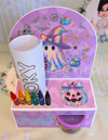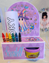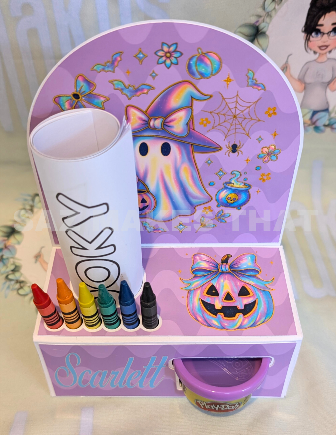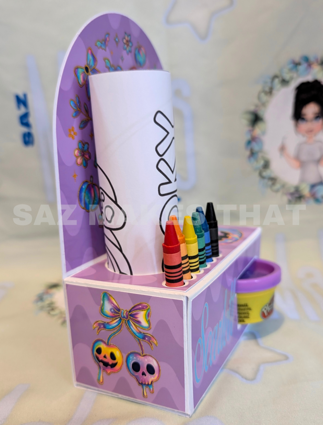 the file fits 6 crayons, 1 28g playdoh pot and I used A5 sized colouring pages, You can personalise with images and text for print then cut or just cut from plain or patterned card.